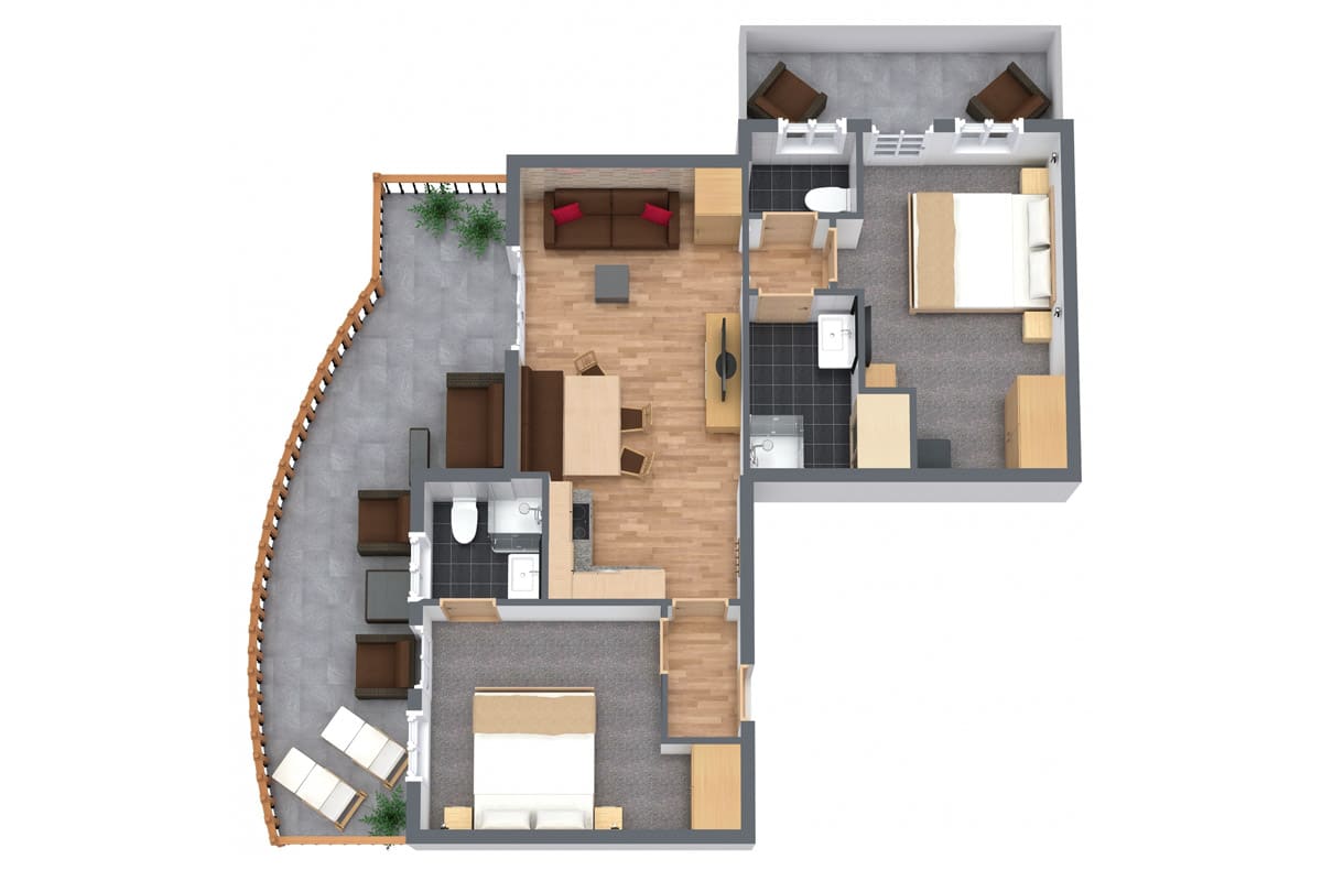 Puitalm – hoch oben. Und ziemlich weit weg vom Gewöhnlichen. Apartments mit Stil, Aussicht zum Einrahmen und diesem leisen Gefühl von: „Hier bleib ich.“ Viel Licht, gutes Design, durchdacht bis ins Detail – und ja, jede Einheit hat ihren eigenen Balkon oder eine Terrasse mit echtem Panorama. Kein Zoom, kein Filter. Dazu: unser Spa. Infinity-Pool mit Talblick, Panoramasauna, Dampfbad, Ruhebereiche mit Aussicht. Für alle, die nach dem Draußen wieder ganz bei sich ankommen wollen. Ob du wanderst, liest, arbeitest oder gar nichts tust – hier oben fühlt sich alles besser an. Dein Platzhirsch: 76–93 m² Wohnfläche | 2 Schlafzimmer | Balkon mit Panoramablick Belegung: 4–6 Personen Ausstattung: Zwei Schlafzimmer mit Doppelbett und jeweils eigenem Bad, Großzügige Wohnküche mit Sitzecke (ausziehbar), Essbereich mit Platz für alle, Balkon mit Weitblick, 2 Parkplätze inklusive