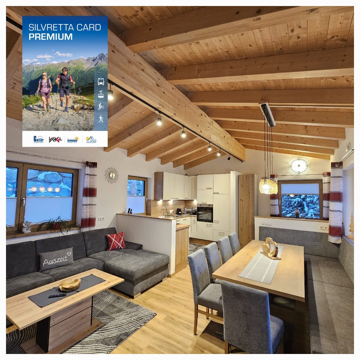 Preise verstehen sich exklusive Ortstaxe (Sommer + Winter) Die Ortstaxe beträgt 5,00€ pro Person und Tag (Kinder bis 15 Jahre sind Kurtaxenfrei). und exklusive Silvrettacard Premium (Sommer 2026 Erwachsene 7,00€ und Kinder 3,50€ pro Person und Tag) Die Ortsrtaxe und die Silvrettacard Premium müssen vor Ort in bar bezahlt werden.