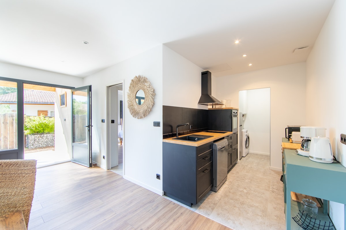 Venez vous ressourcer dans cet appartement charmant, au cœur du magnifique Bassin d’Arcachon. Profitez d’une grande chambre cosy avec lit double (140 cm) et vue paisible sur le jardin, d’une salle de bain lumineuse avec fenêtre sur les bois, d’une cuisine avec coin repas, ouverte sur l’extérieur grâce à une porte-fenêtre. Nous vous accueillons avec grand plaisir. Si vous souhaitez des conseils pour découvrir les meilleures activités, restaurants …., nous serons ravis de vous guider
