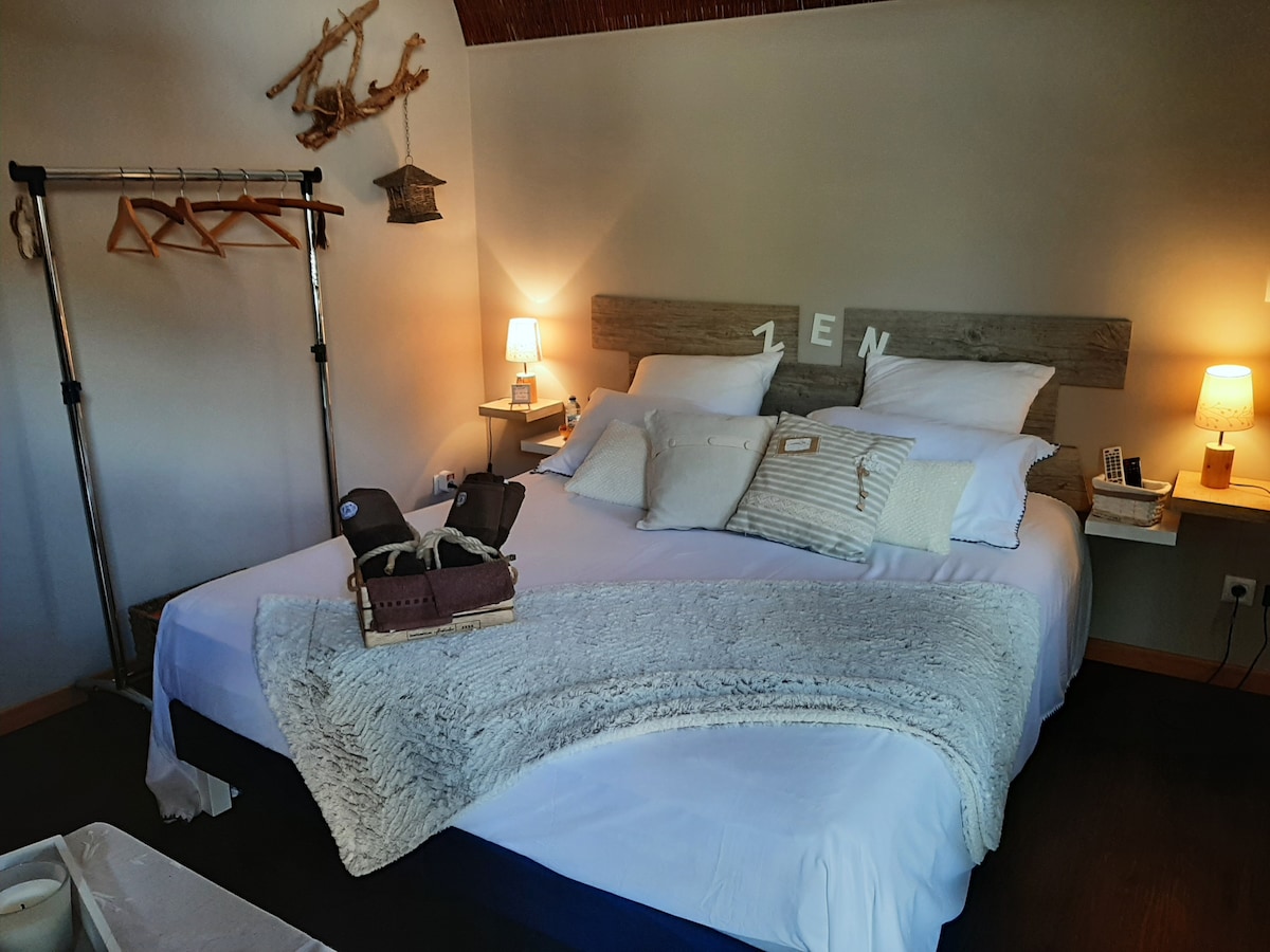 Chambre indépendante 18 m2 avec drap couette frigo machine à café micro onde assiettes et couverts TV 128cm plancha Douche WC privée sèche cheveux terrasse couverte table chaises et hammac. Grand jacuzzi dans chalet petite piscine 3,50x2 m rideau occultant pas de vis à vis Possibilité de laver sécher le linge prêt VTT piste cyclable Plage surveillée à 3kms Plage naturiste tolérée piste cyclable Pizzeria à 700m Bar à tapas, restaurants supermarché, tabac à 2 kms Petit déjeuner offert wifi