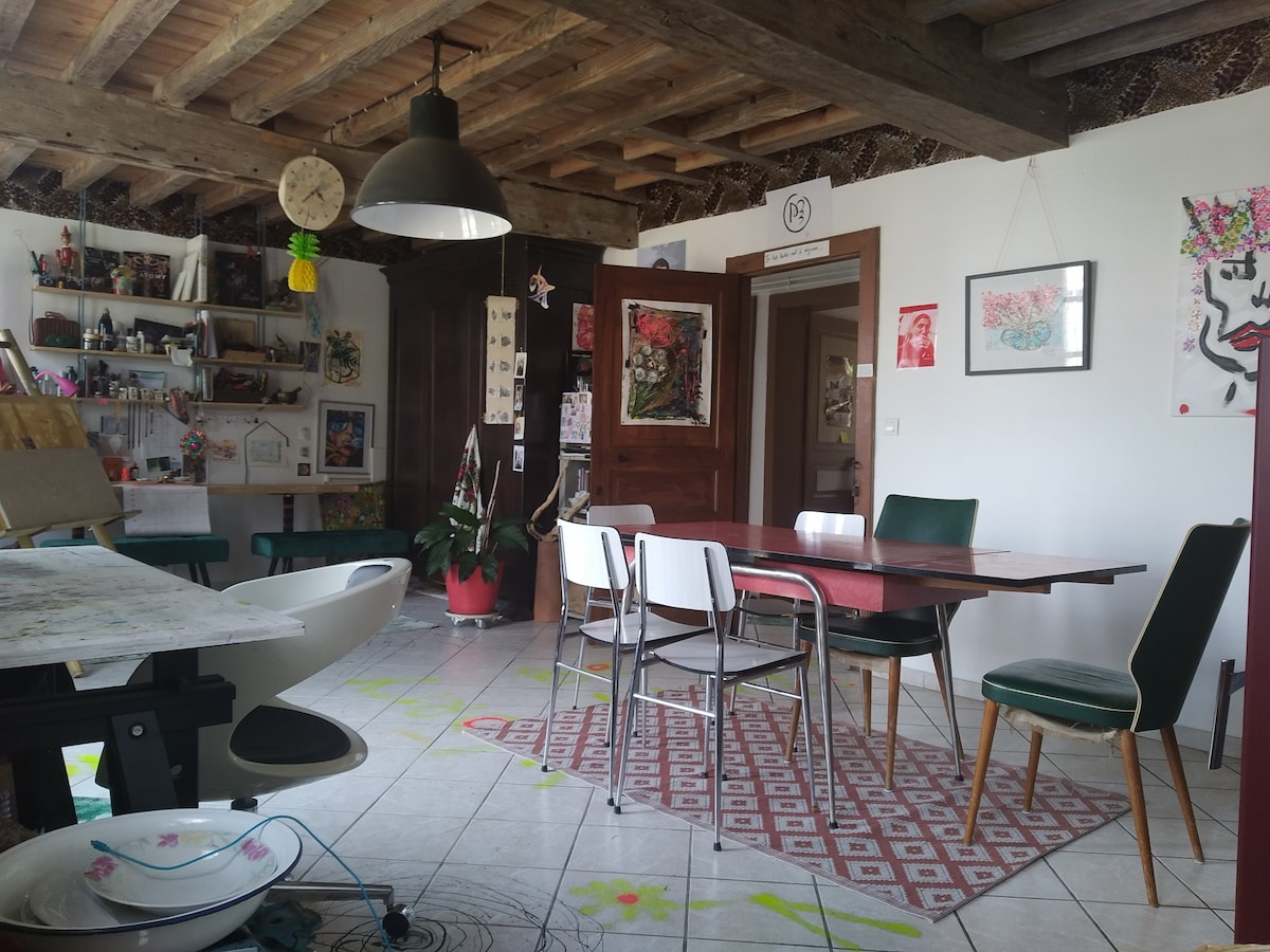 Maison atypique où l'art a une place importante. Pas de serviettes de bain. Pas de petits - déjeuners fourni. Pas de micro-ondes.Vie en collectivité, en mode simple. Chambre privée et salle d' eau à partager. Espaces communs. Ecomusée Marquèze et balade Forêt d'art contemporain à bicyclette. Réserve naturelle d' Arjuzanx 15 min et Contis- plage 50 min en voiture. Possibilité de massages professionnels par Thaïlene, me contacter en avance pour votre rendez-vous.