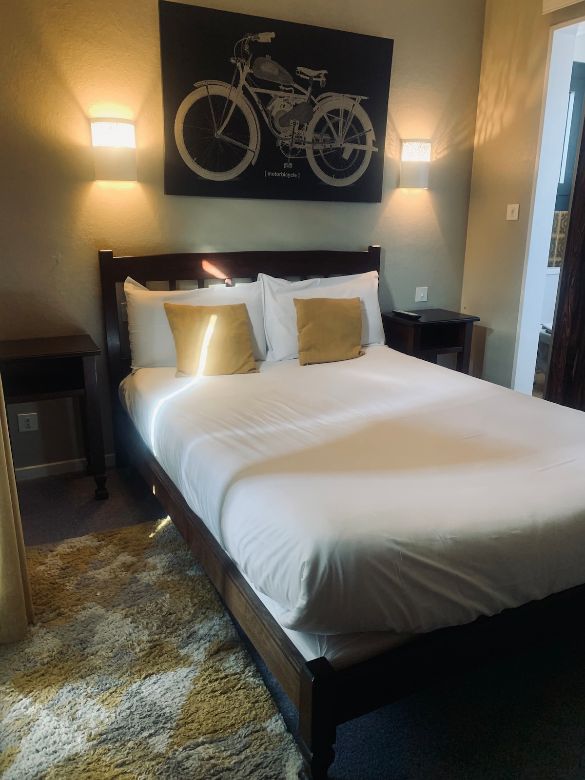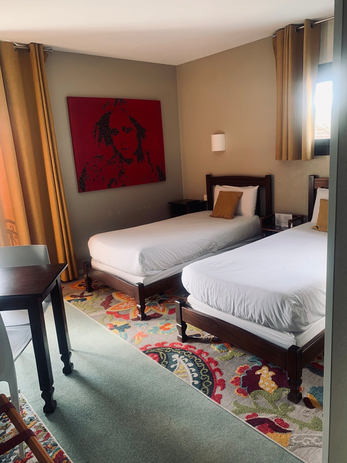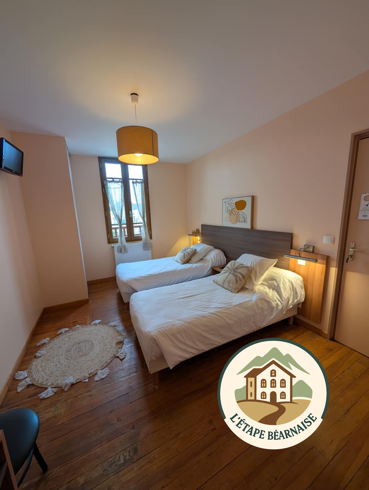 Chambre à 2 lits de 90x140 dans un hôtel. Salle d’eau et toilettes privatives. Le stationnement n’est pas une difficulté même pour les véhicules imposants. Logement non fumeur. Un micro onde et une machine à café sont à disposition sur le palier.