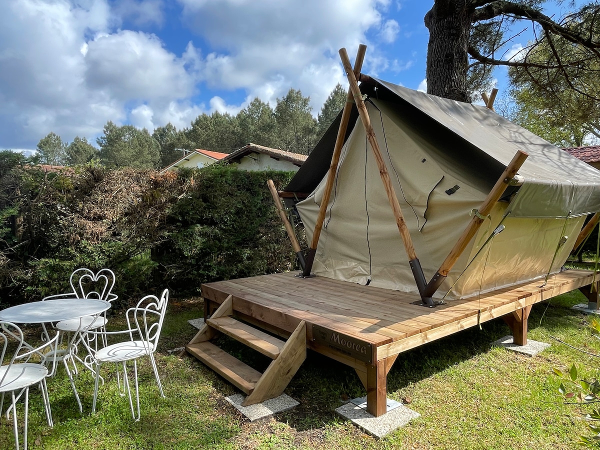 Located in the La Téouleyre natural area, 7km from the ocean (direct access to the cycling path from the property), we offer our customers looking to get closer to nature during their holidays the "Oak Tipi," set up on a wooden platform under the oak grove. Enjoy a camping experience in a relaxing setting, thanks to this fully equipped tent: Large 160 bed, Glass minibar, Senseo coffee maker, and electric kettle.