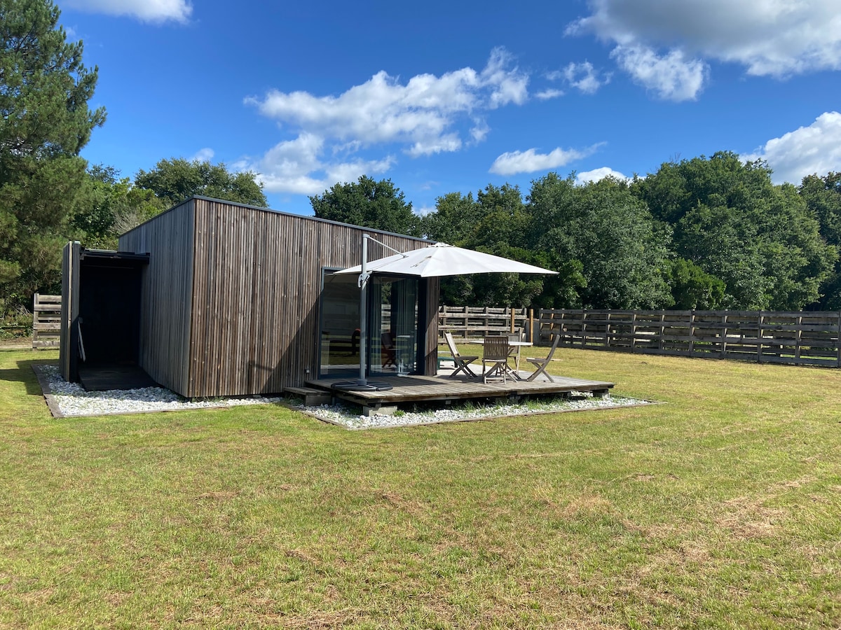 Petite maison moderne indépendante en bois : pièce à vivre avec coin cuisine, table pour 4 et coin salon avec canapé convertible, chambre séparée, salle d'eau avec douche. L'accès à la maison est privatif. Vous pourrez profiter de son jardin ainsi que de sa terrasse aménagée avec barbecue et transats.