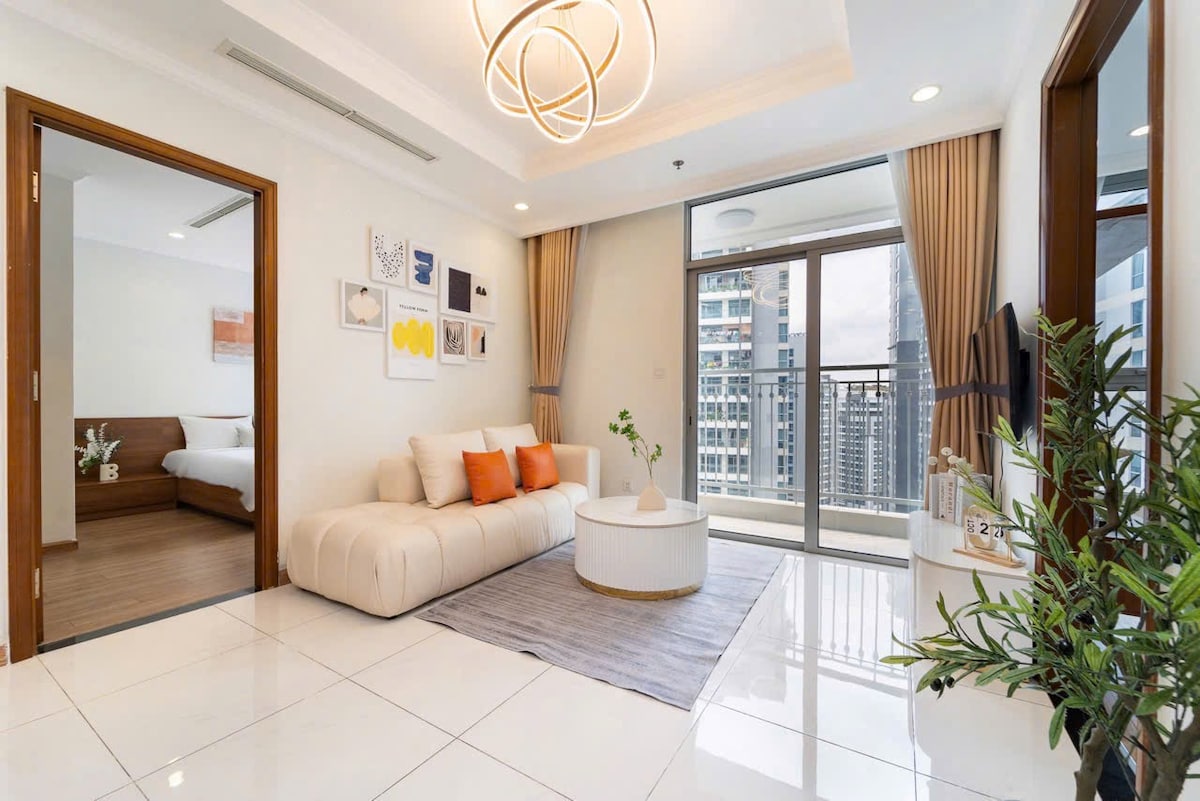 Welcome to our newly launched apartment located in Central 3 – one of the building in the Vinhomes Central Park complex The apartment features a modern and stylish design, with an open view that's not blocked by any surrounding buildings It includes two queen-size beds. The master bedroom is equipped with a projector, perfect for "Netflix and view" The apartment comes with a fully equipped kitchen, iron, hair dryer, and other essentials. Fresh towels can be replaced free of charge upon request