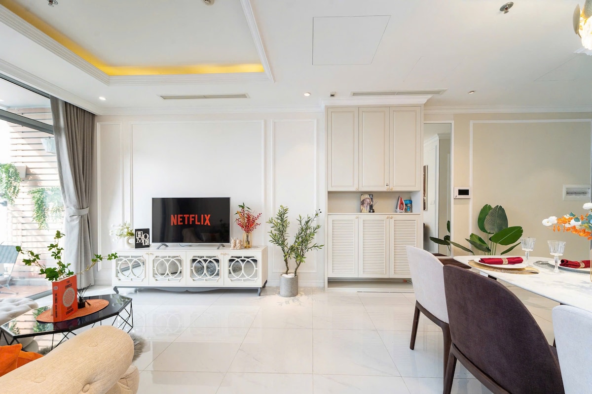 Welcome to our newly launched apartment located in Central 3 – one of the building in the Vinhomes Central Park complex The apartment features a modern and stylish design, with an open view that's not blocked by any surrounding buildings It includes two queen-size beds. The master bedroom is equipped with a projector, perfect for "Netflix and view" The apartment comes with a fully equipped kitchen, iron, hair dryer, and other essentials. Fresh towels can be replaced free of charge upon request