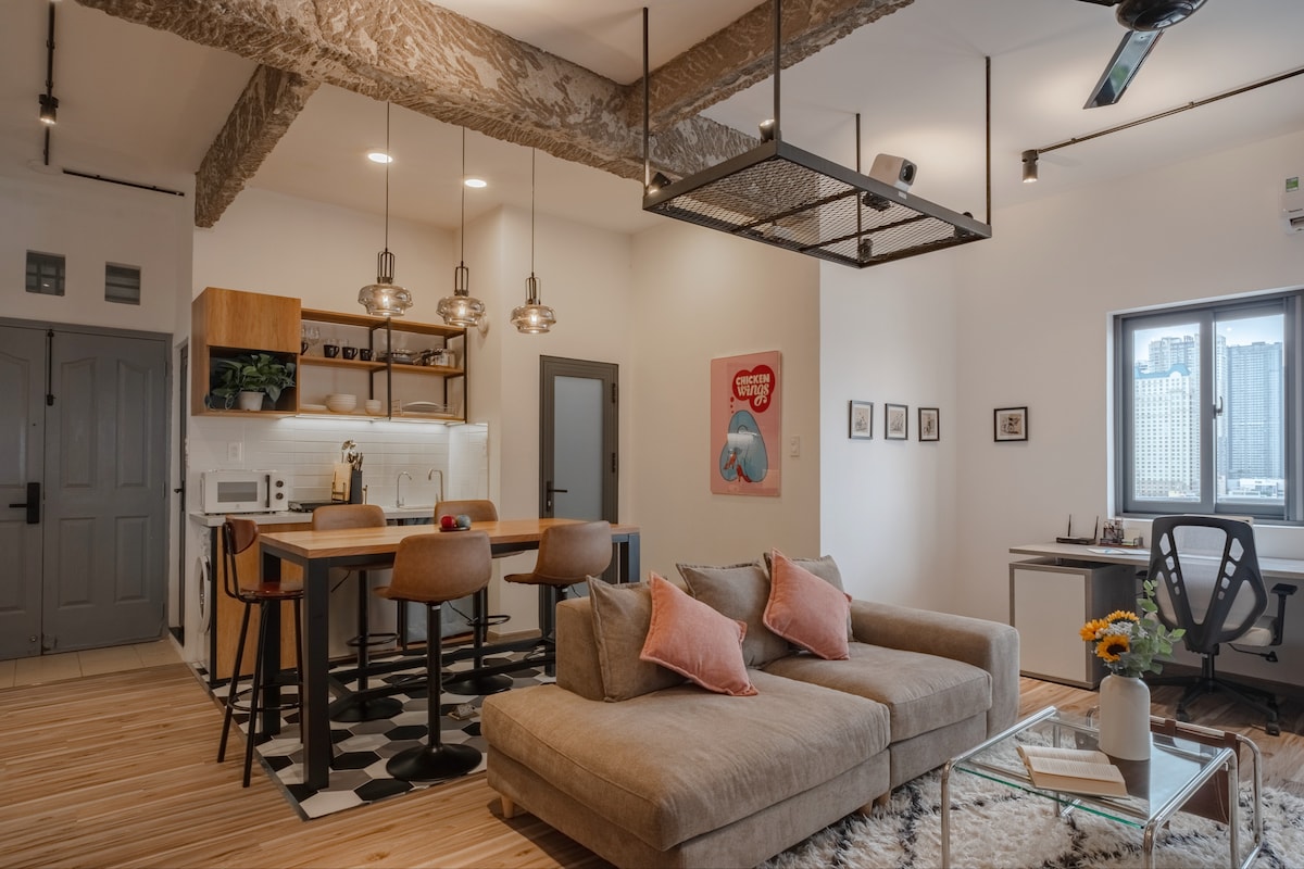 Escape from the hectic streets of Saigon with our chic industrial 2 bedroom! Our stylish unit features expansive views of the city, lots of sunlight, and amenities to make your stay fun, comfortable and productive. Highlights include our vinyl player with LPs, a movie projector, and a huge coffee bar with Nespresso machine and several coffee options (beans included!) This unit is on Pham Viet Chanh Street, which Timeout Magazine named one of the coolest neighborhoods in the world.