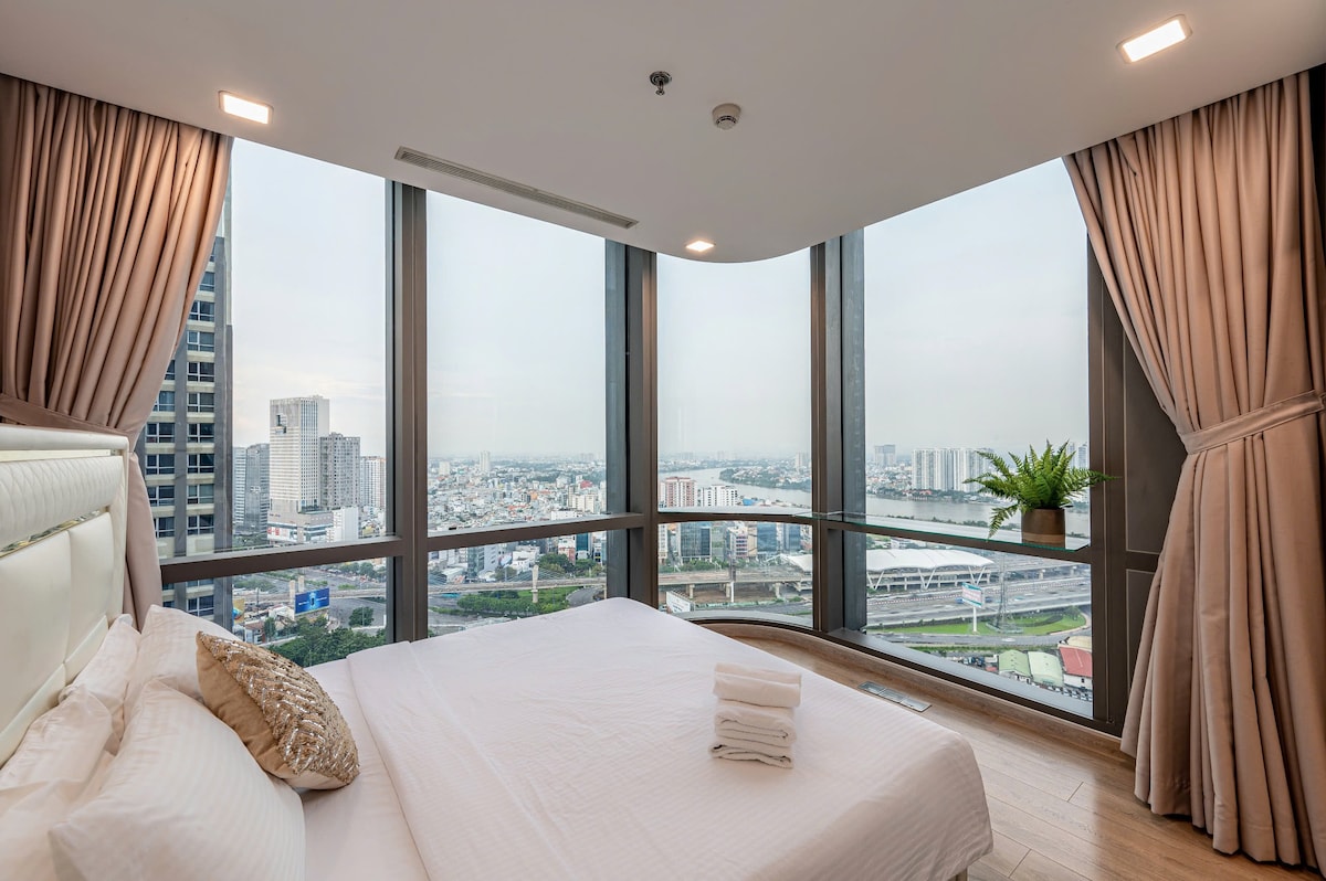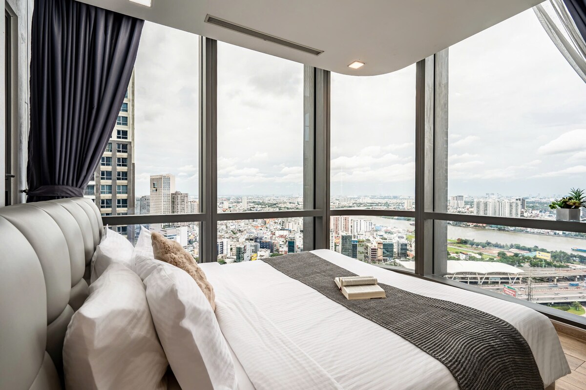 Trải nghiệm không gian sống hạng sang tại Duplex Penthouse mới xây, phong cách Wabi-Sabi độc bản. Tận hưởng tầm nhìn ôm trọn sông Sài Gòn, cầu Ba Son và Quận 1 từ cửa kính full-height, đặc biệt đẹp về đêm. • Vị trí kim cương: 5-10 phút đi bộ đến Công viên bờ sông & Metro Ba Son. • Nội thất xa xỉ: đàn Piano, Smart TV 86", đèn chùm lớn, bồn tắm thư giãn. • Không gian: 3 phòng ngủ, tràn ngập ánh sáng, lý tưởng cho 4-6 người.