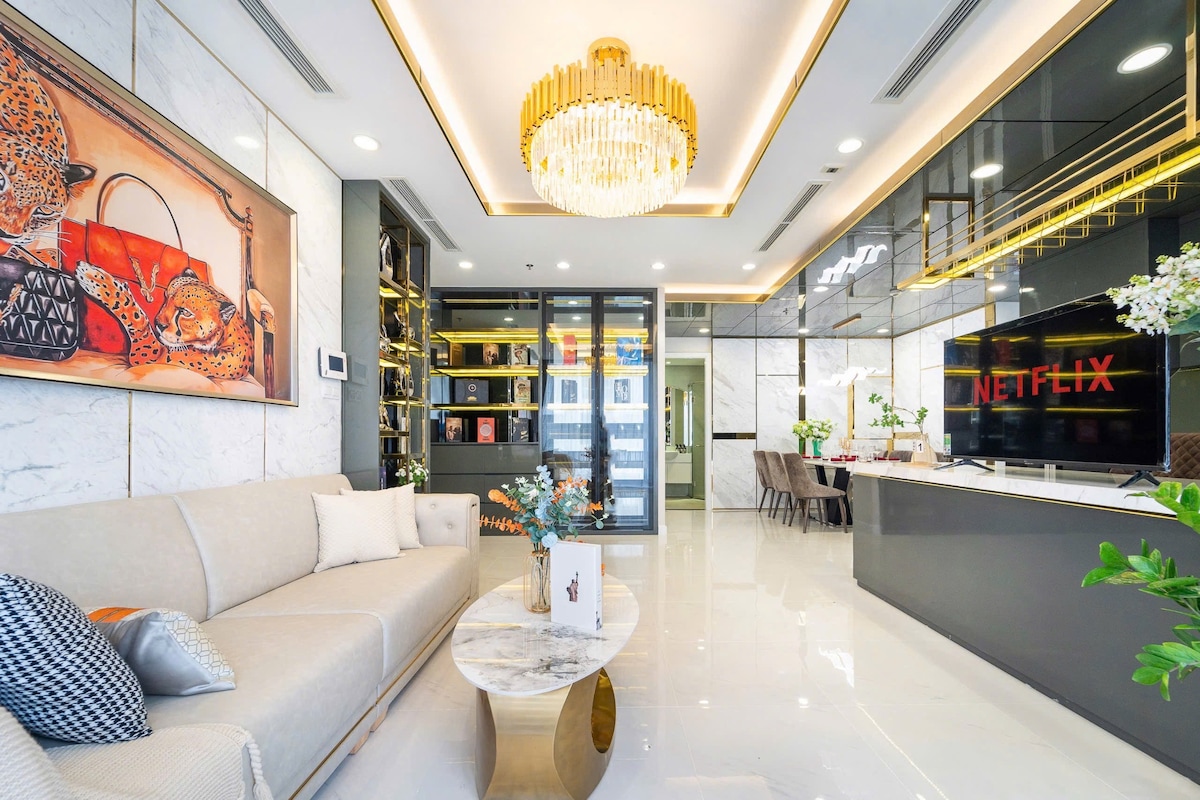 Stylishly-renovated 1-bedroom apartment on top floor of tower with a clear view of the famous Landmark 81 tower; especially beautiful at night. Fully-equipped with wide range of amenities (see photos) unmatched by other apartments in the city, fast customer service until late. Staying with us is the best choice for Guests who value reliability and convenience. Located in Vinhomes Central Park, a high-end area with restaurants, cafes, a mall, and Landmark 81. Just 10-15 minutes to city center.