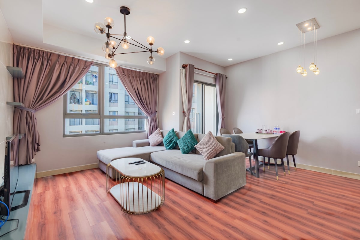 Cozy luxury apt on 6th floor located in a prime location just 10 minutes drive from the city center. 64sqm wide apt with all amenities and space to make you feel like at home. You can lie down on a soft king-size bed for a good night's sleep, cook in the kitchen, lie on the sofa watching the Landmark 81 building sparkle at night or sip a hot cup of coffee on the balcony watching the sunrise. A luxurious rooftop swimming pool, 2 mini supermarkets: 7 eleven and Winmart. Friendly and helpful owner.