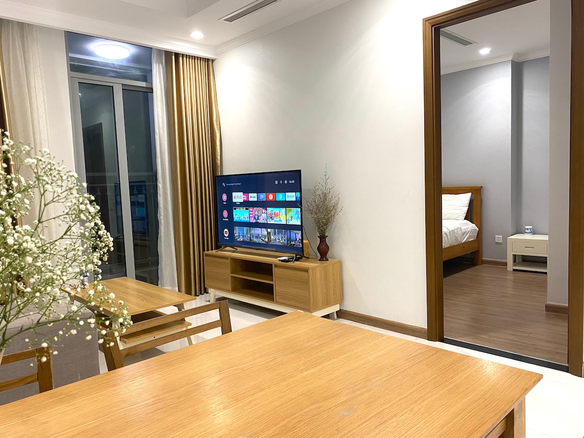 Cozy luxury apt on 6th floor located in a prime location just 10 minutes drive from the city center. 64sqm wide apt with all amenities and space to make you feel like at home. You can lie down on a soft king-size bed for a good night's sleep, cook in the kitchen, lie on the sofa watching the Landmark 81 building sparkle at night or sip a hot cup of coffee on the balcony watching the sunrise. A luxurious rooftop swimming pool, 2 mini supermarkets: 7 eleven and Winmart. Friendly and helpful owner.