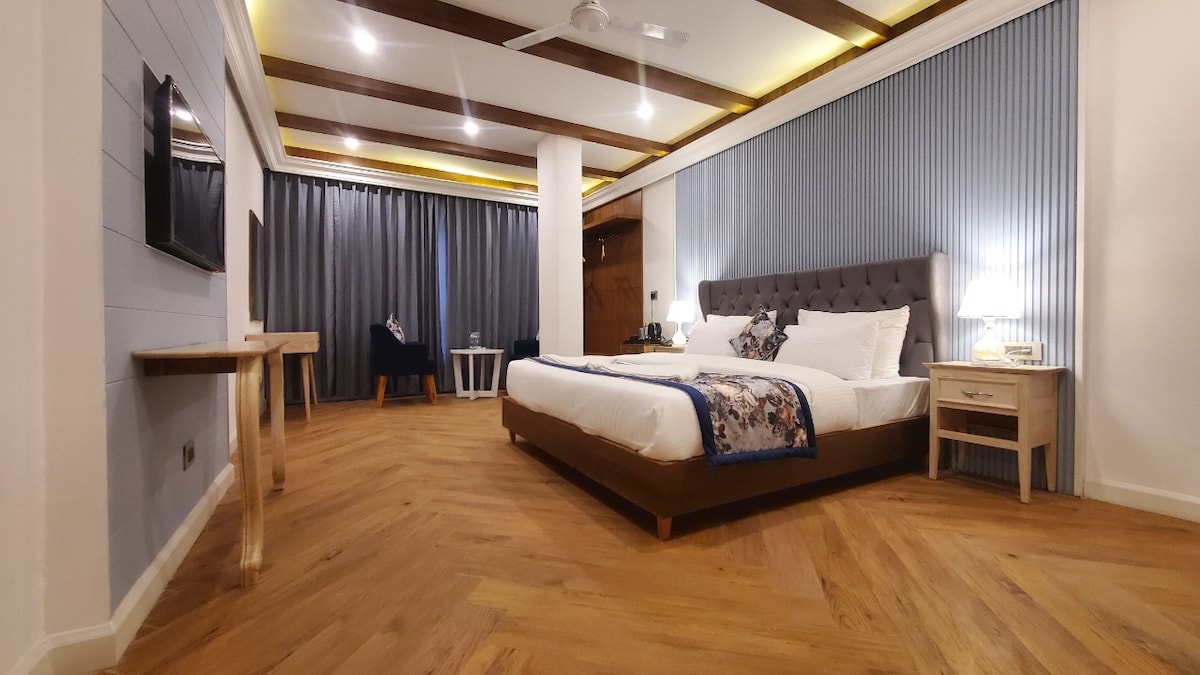 Nestled amidst the serene hills of Mussoorie, our hotel room is a cozy retreat that blends comfort with nature. As you enter, you're greeted by warm wooden accents, soft ambient lighting, and plush furnishings that invite you to unwind. The room is spacious yet snug, with a comfortable king-size bed facing large glass doors that lead out to the highlight of your stay — the private balcony. Stepping out onto the balcony, you’re met with a sweeping panoramic view of the lush Doon Valley below.