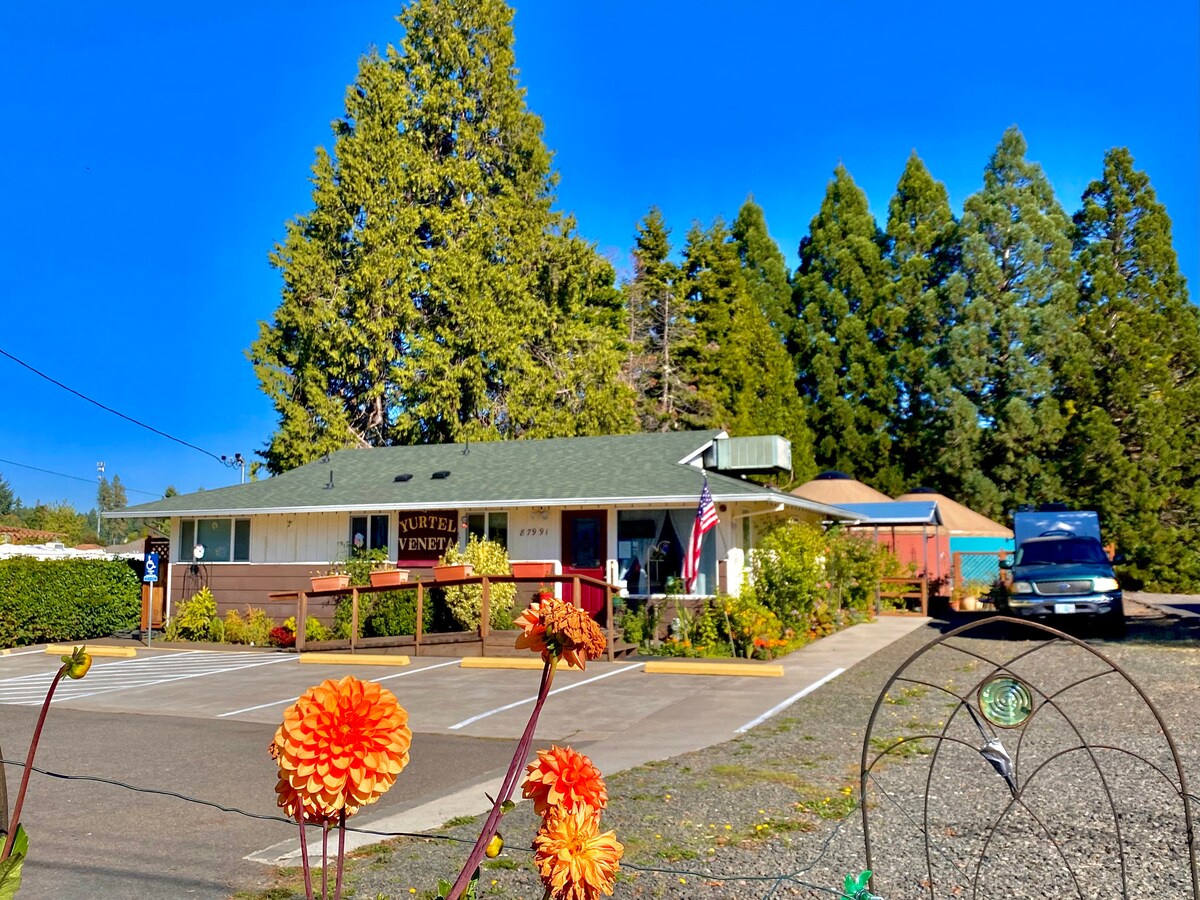 Mystical Rose is uniquely themed, red or terra cota exterior yurt. It is 24' in diameter with cool A/C and warm heat from it's own heat pump. Enjoy a complimentary selection of coffee and self-serve breakfast items. It is close to restaurants, great wineries near by and tasting rooms all with views etc. You’ll love my place because of the Yurts are themed, to quote several people "WOW". I am part of Yurtel-Veneta, a 3 Yurt bed and breakfast.