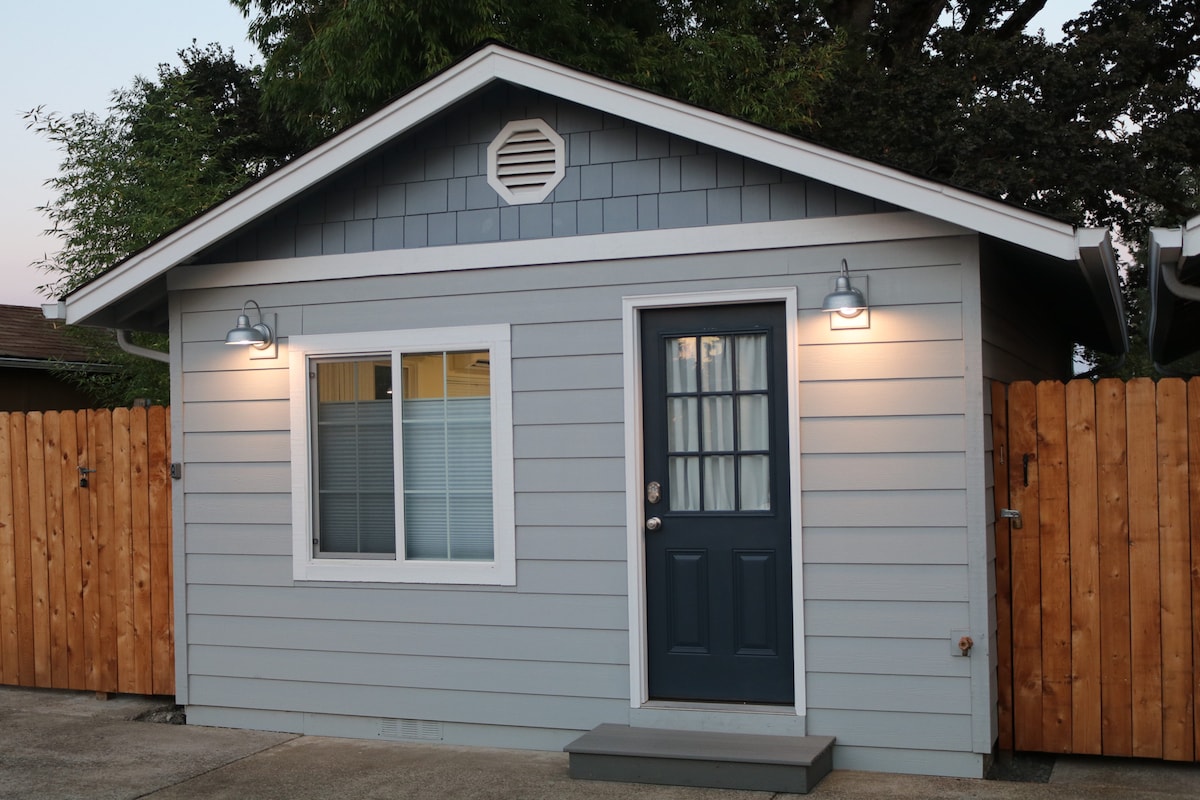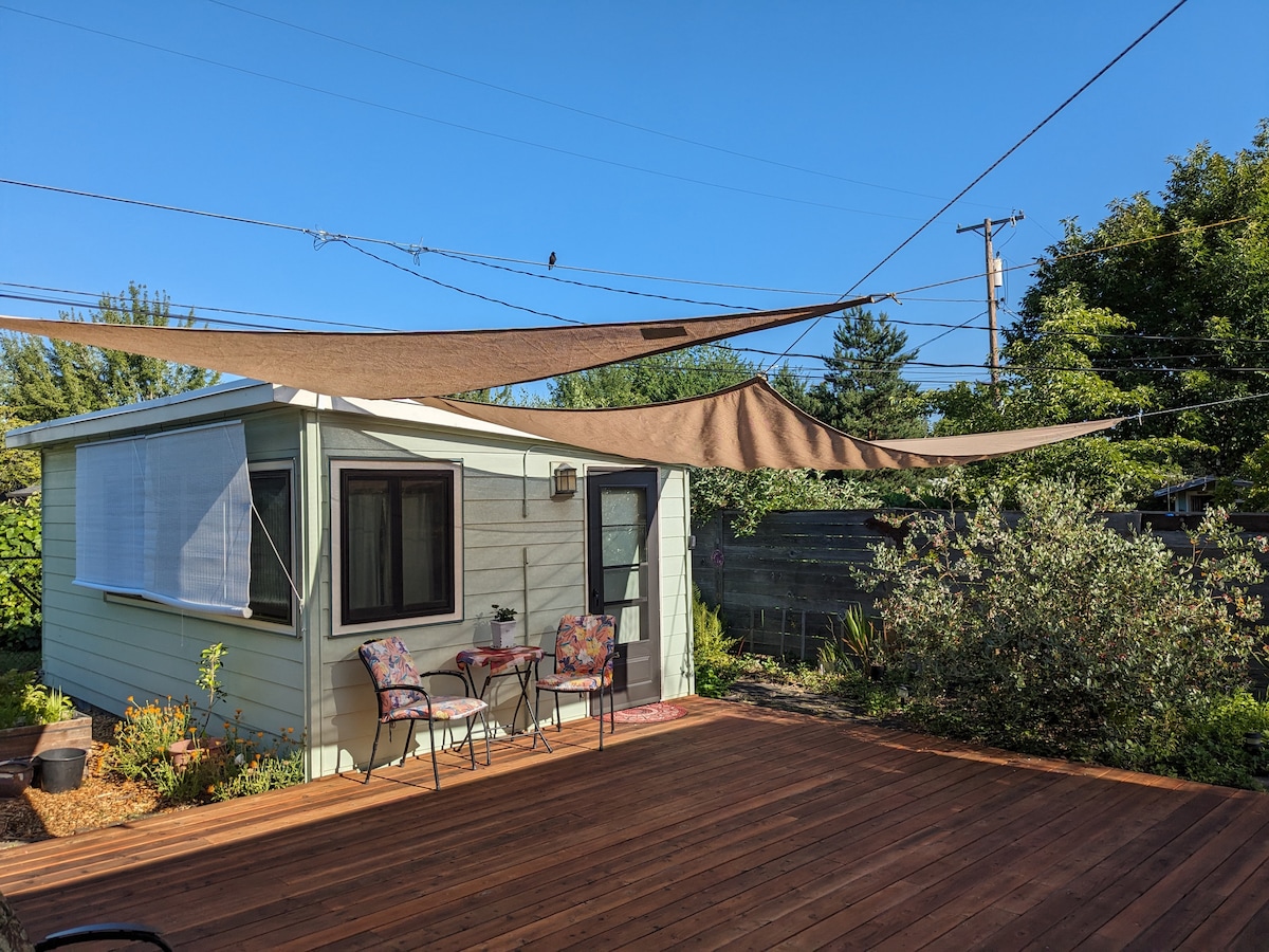 Architecturally designed backyard cottage located one mile south of the University of Oregon adjacent to Eugene's historic Masonic Cemetery. This contemporary Northwest space includes a spacious living area with a new king-sized bed, smart TV, WiFi, kitchen, bathroom, private sauna and hot tub, and a spacious deck to enjoy beautiful sunsets. Located within walking distance to the University, coffee shops, Amazon Pool, and neighborhood stores. Enjoy dedicated parking and a beautiful setting.