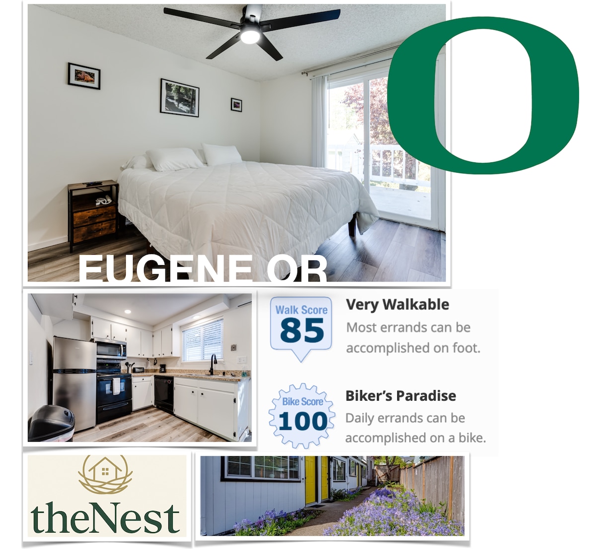 A stylish and cozy, South Eugene Guesthouse Studio. 1 mile south of the UofO campus and 3 miles south of Autzen Stadium. Ask about our Tesla Y rental and/or electric bikes to explore the city's extensive bike path system (message for availability), attend a UofO event OR enjoy this beautiful city! Come sip your morning coffee on the outdoor patio and enjoy a "secret garden" like setting. A child travel crib can be provided upon request and the electric bikes can be fitted with a toddler seat!