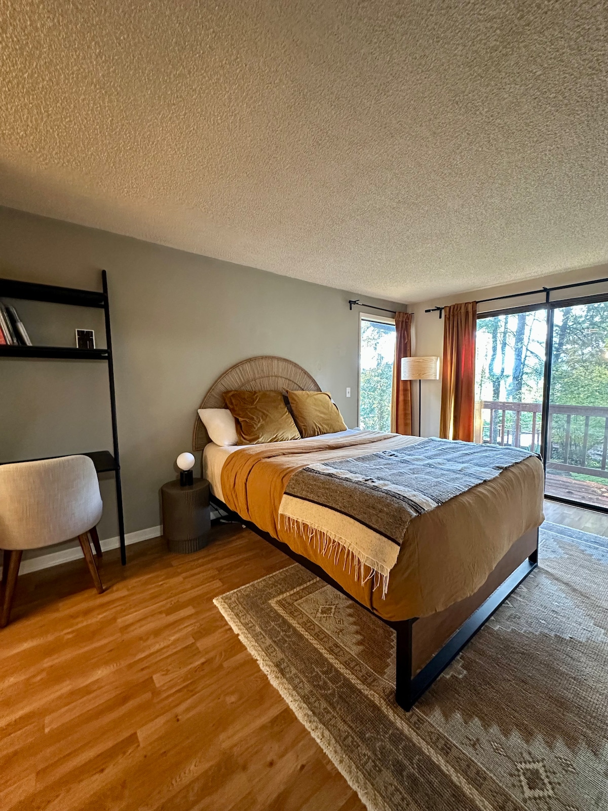 Enjoy a peaceful getaway in the woods in this serene, bright house in the SW Eugene Hills. Sip your morning coffee while watching deer and wild turkeys forage in the greenery. 1 BR with balcony, loft space with balcony, and 2 BTH, w/ en suite BTH, laundry, newly renovated kitchen, AC, outdoor deck, full of light and windows. Furnishings: Kartell, WestElm, Lulu & Georgia, Citizenry. 15 min to University of Oregon and to lovely Willamette Valley wineries. 13 min drive to Hayward Field. No pets.