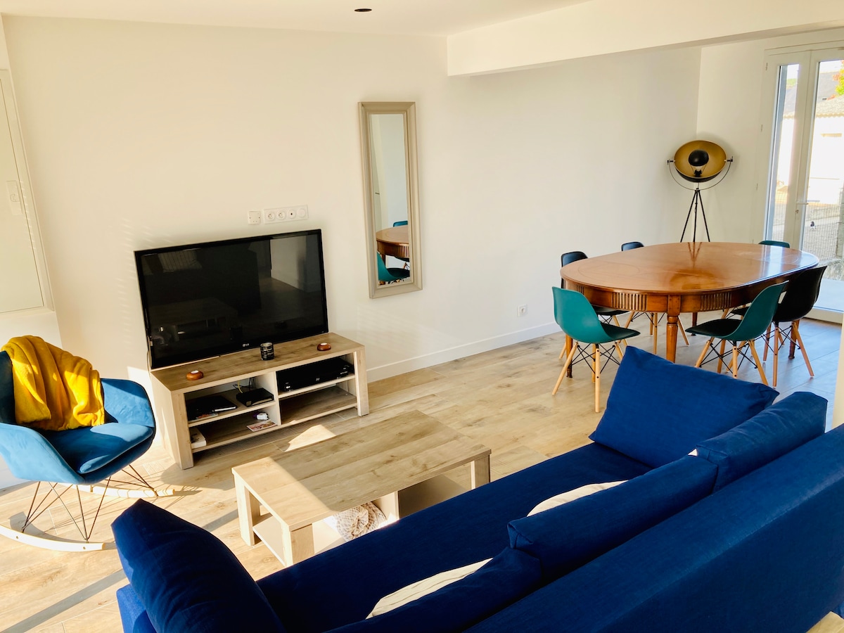 Jolie maison de ville rénovée et décorée avec goût, au calme dans une impasse à proximité des commodités. 1 chambre au 1er étage avec un lit de 160 et canapé lit 2 couchages (140) dans la pièce de vie. Cuisine équipée d'une plaque avec hotte, réfrigérateur et congélateur,d'un micro onde et d'une cafetière (filtre). Ilot pour les repas et ses 4 chaises de bars. Grand téléviseur dans la pièce de vie. Salle de bain double vasque et douche à l'italienne. WC séparé. Aspirateur, fer à repasser. Wifi