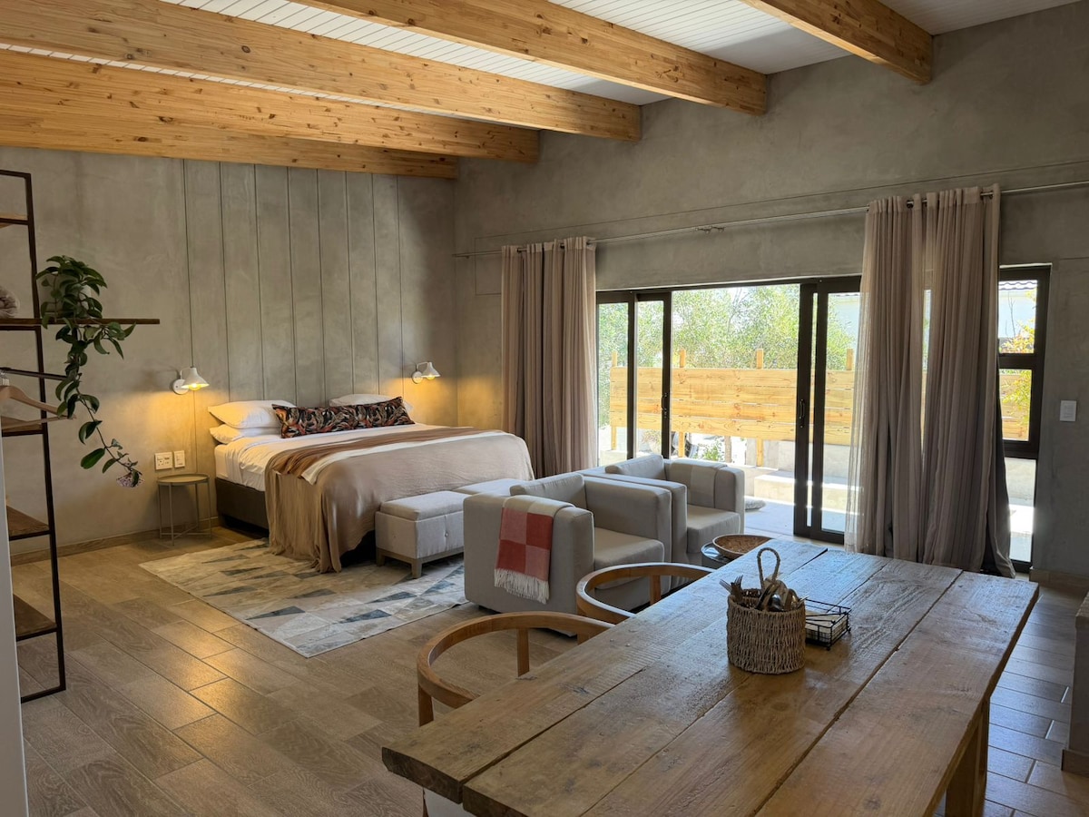 The Stonehouse – Cozy Comfort for Two Perfect for couples, this open-plan unit features a king-size bed, en-suite shower, and a kitchenette with microwave and 2-plate stove. Relax in the comfortable seating area, stay connected with free Wi-Fi, and enjoy your private braai facilities. Guests also have access to a sparkling communal pool — the ideal spot to unwind after exploring Langebaan.