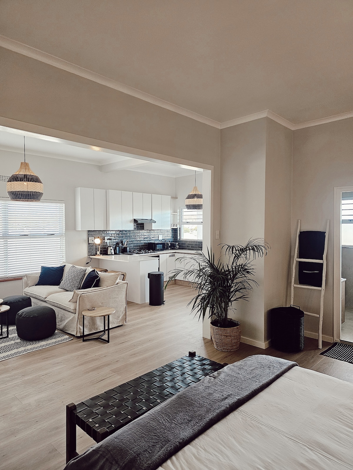 "Warm n light" self contained guest unit only 150m walk to a beautiful beach, located half way between Langebaan and Club Mykonos! This ground floor flatlet has a living room with kitchenette (Fridge, Induction Hob, Microwave Oven, Kettle and Toaster) and a separate bedroom with full en-suite bathroom. Both living room and bedroom have separate fans and heaters for comfort, plus sliding doors to its own stoep/patio. Common use of large braai and swimming pool areas. Private Parking for 1 car.