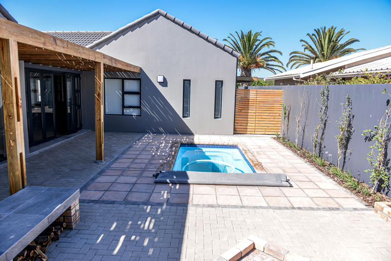 NO LOADSHEDDING – Modern 3-Bedroom Home in Langebaan Enjoy a relaxing escape in this stylish 3-bedroom home, completely free from loadshedding interruptions. Designed for comfort and entertainment, the home features a spacious entertainment area, a sleek modern kitchen, and seamless indoor-outdoor flow. Step outside to a large, secure garden with a private swimming pool (5 x 2.5 x 1.3m). A pool cover is available upon request. Stay connected with uncapped 25Mbps fibre internet!