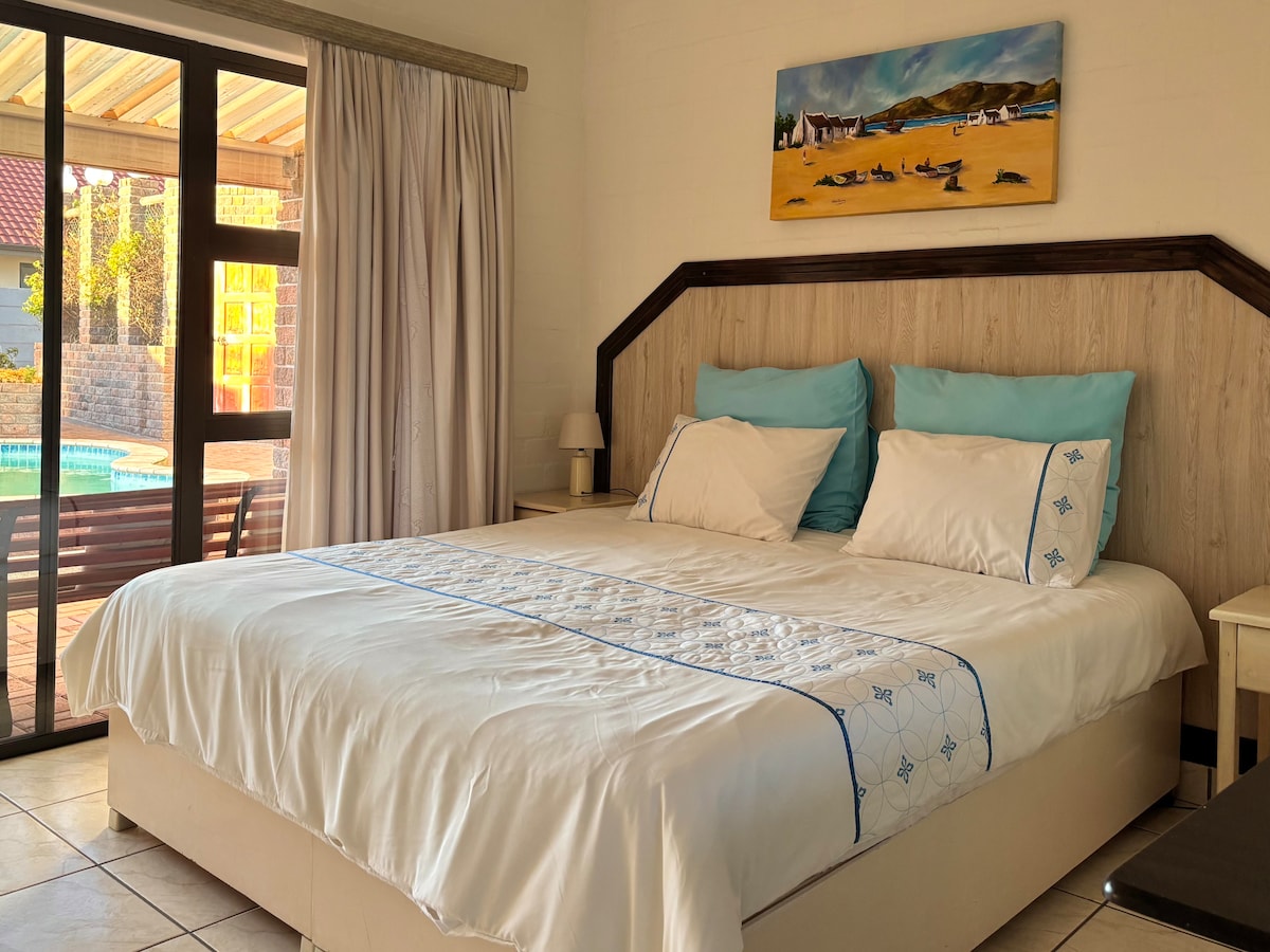 New Moon features a large bedroom with bay window to the natural reserve where your may catch a glimpse of a the buck or a mongoose. Also includes a kitchenette with kettle, toaster & air fryer. Small dining table & chairs. Outside private courtyard with table and benches. Gas braai for your use. Lovely bathroom with shower. Take a break and unwind. This unit is situated in the Golf Estate - with facilities like a pool, tennis courts, paddle courts, putt-putt, gym, club house and restaurant.