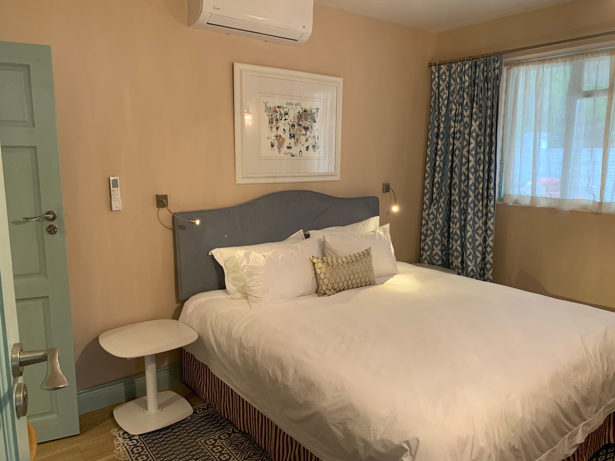 Come see the whales and taste the wine! Romantic, self-catering cottage with quality finishes in secure estate, Onrus – 30 min walk to beach. Nestled among trees, safe, private, own entrance. Sleeps 2 adults in en-suite bedroom + 2 adults/children on bunk beds in lounge (no children under 2 years plse). Free sherry & firewood! Wi-fi, DSTV, Netflix, free parking. Sun deck with gas BBQ. Quality linen. Aircon. Markets, wine routes & nature walks. Note: There are stairs. GENERATOR FOR LOADSHEDDING