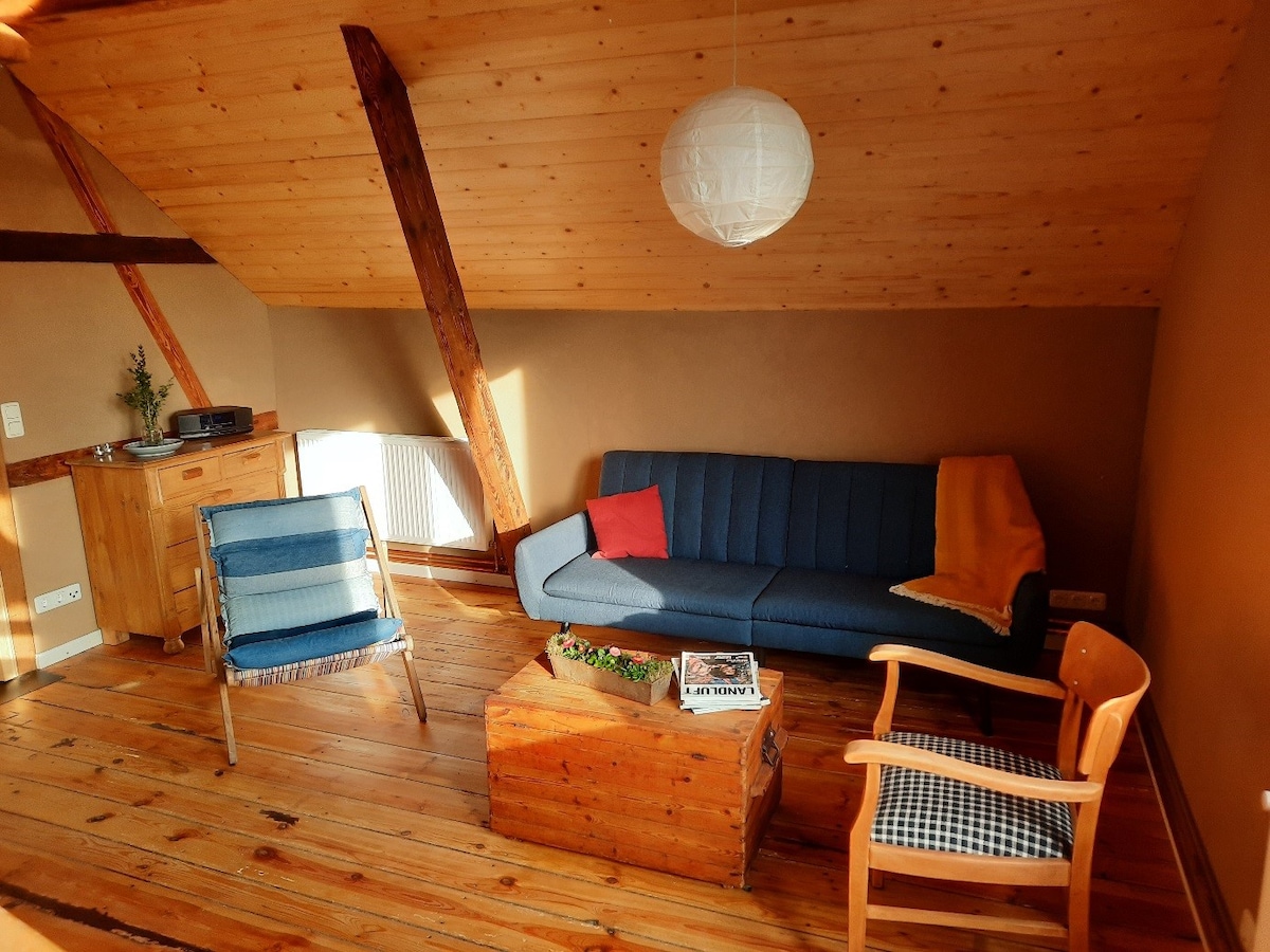 Die Ferienwohnung verfügt über einen großen und gemütlichen Wohnbereich mit integrierter Küche. Es gibt zwei Schlafzimmer mit jeweils einem Doppelbett. Als Option für einen weiteren Schlafplatz steht ein Schlafsofa im Wohnzimmer zur Verfügung. Zwei weitere Matratzen-Schlafplätze befinden sich auf der Hochebene. Das helle und großzügige Bad verfügt über eine Dusche und WC. Die FeWo befindet sich im oberen Geschoss unseres Hauses. Im Garten steht ein sonniger Sitzplatz mit Grill zur Verfügung.