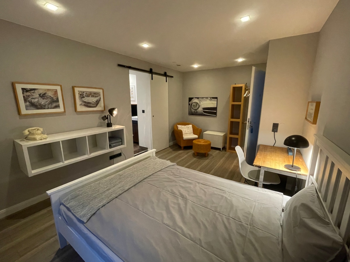 Stylish Studio Near the Airport – Fully Equipped & Quietly Located The apartment features a double bed (140 cm) and a pull-out sofa. The kitchen is fully equipped with everything you need. There is fast Wi-Fi and a TV. The airport is easy to reach, and the trade fair is about a 30-minute drive away. A bus stop is just 250 meters away. In the immediate vicinity, you’ll find: EDEKA (supermarket), a bakery, a pharmacy, a kiosk with postal services, and a gas station.