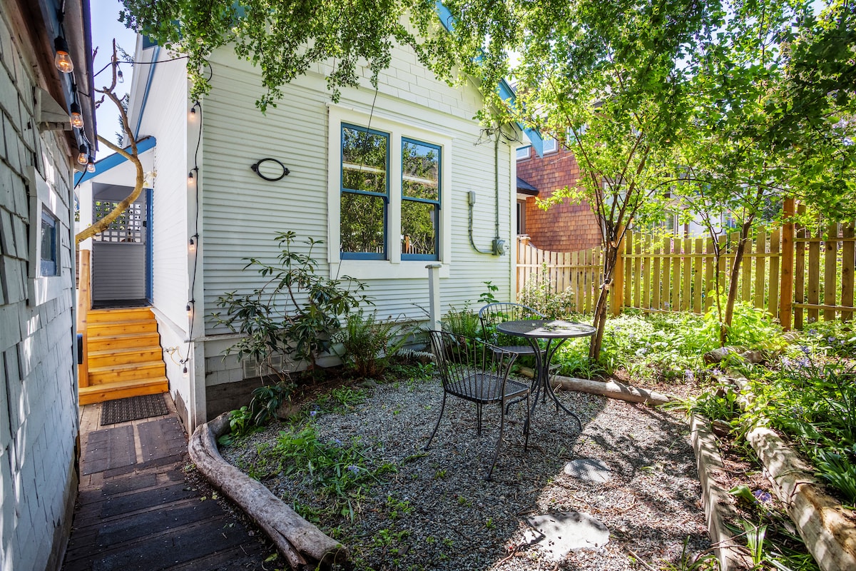 See the ocean sights then come home and enjoy the sunshine and views from your deck. Explore your yard which includes a cedar keg sauna and a jacuzzi surrounded by palm and bamboo trees. Breathe the fresh air as it rolls in off the great Pacific Ocean. The combination of modern and earthy architecture relaxes the shoulders and allows the mind to clear. Tranquility surrounds you. This unique tiny house is cozy, well-kept, and beautifully decorated. A memorable place to call home!