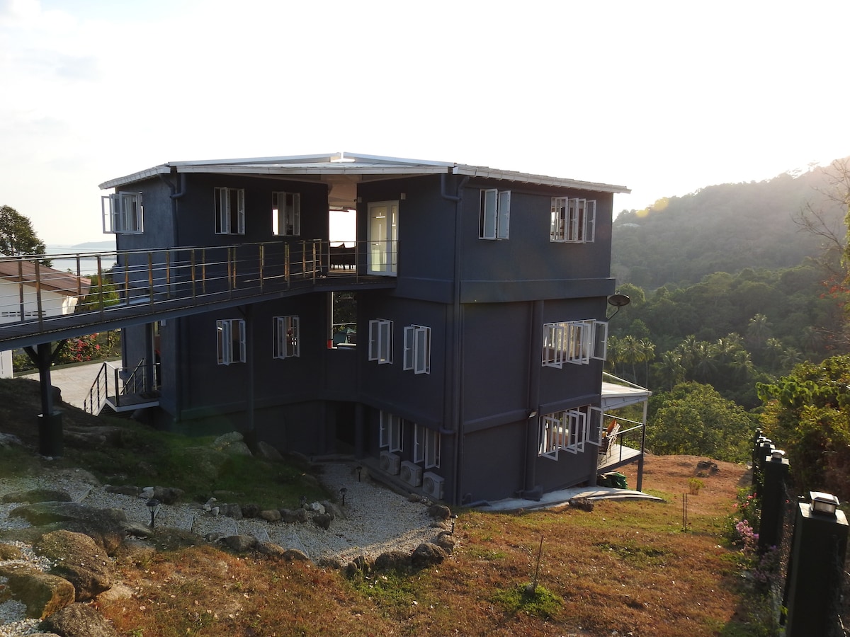 Eagle's Nest Retreat is nestled on a hillside with lush green rain forest behind and stunning views of the sea in front. Very quite and off the tourist track, where peace and serenity is assured. 3 private apartments are available (Eagle's Nest, View and Perch). All are furnished with a King bed and Queen size sofa bed. All with very large balconies to enjoy the nature. Eagles and Hornbills are just a few of the birds and other wildlife can be viewed daily from the balcony. 10 min. to airport
