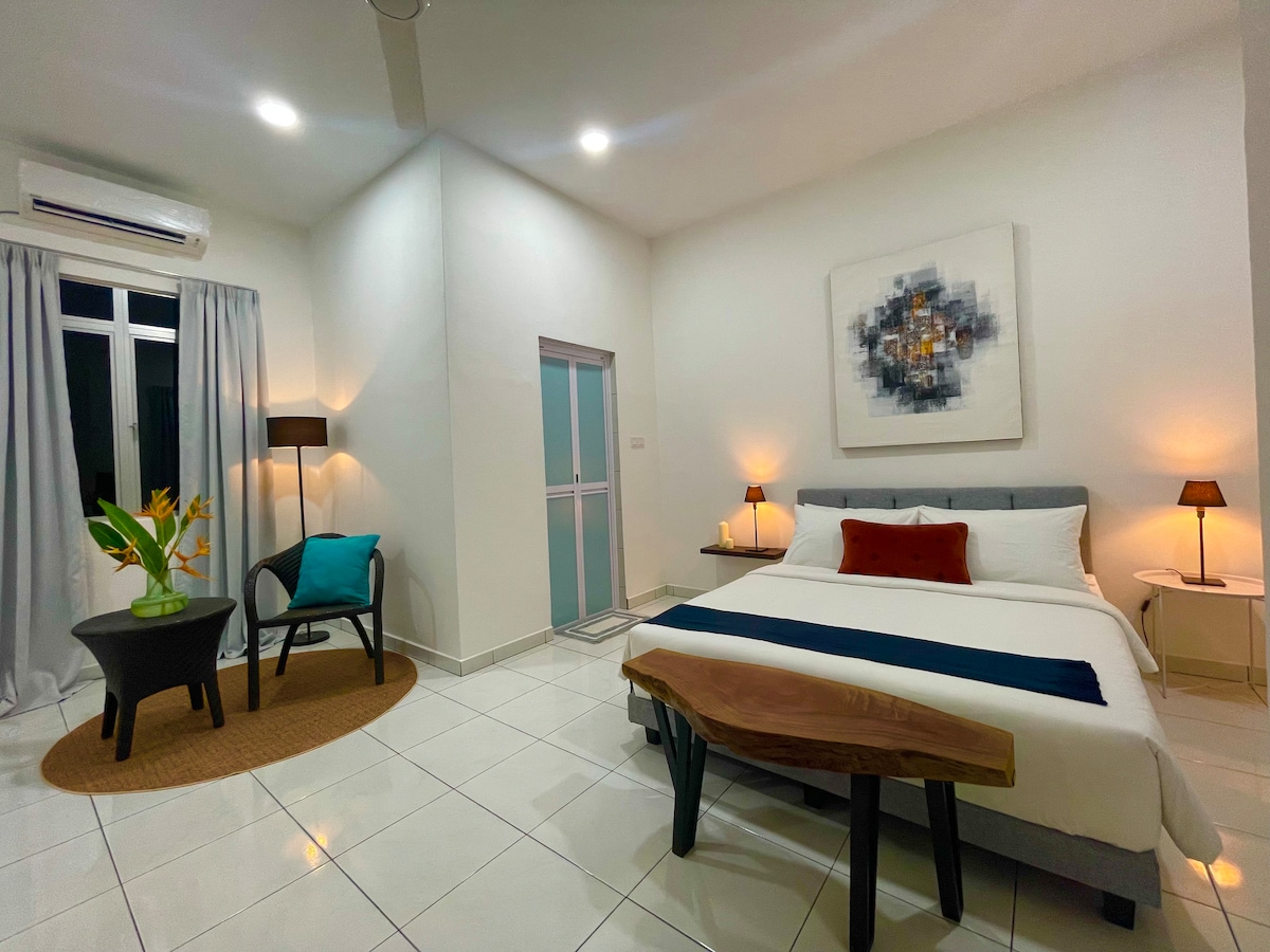 Enjoy a relaxing stay at our modern cozy guesthouse on Cenang Street, just 10 minutes walk to the beach. Perfect for couples, featuring a king-size bed, private bathroom with hot shower, balcony with Cenang River view, air conditioning, TV, mini fridge, kettle and Wi-Fi. Located within walking distance to cafes, restaurants, and shops, you'll have easy access to all that Cenang has to offer.