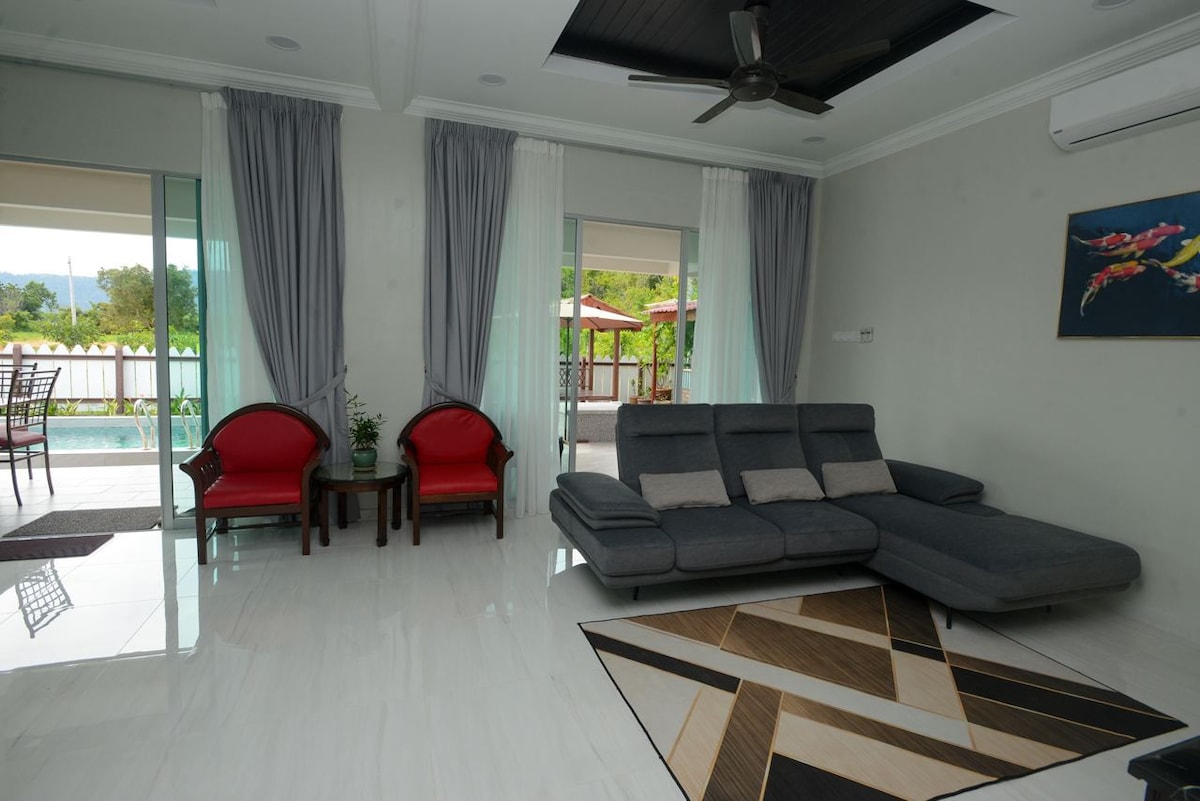Just you and your loved ones, in your very own private villa — no sharing, no disturbances, just pure privacy. Dive into your private swimming pool while enjoying uninterrupted panoramic views of Mount Mat Cincang and the airport runway — a view you won’t get anywhere else on the island. 🏔️✈️ And the best part? You get ALL of this at one of the BEST VALUE PRICES in Langkawi. - 1 Bedroom with Queen Bed - Wi-Fi - Air conditioning - Kitchen - BBQ Pit - Bicycles - Water Purifier - Smart TV