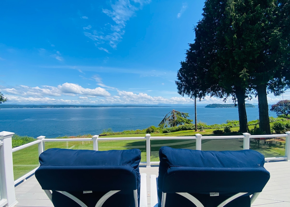 Enjoy breathtaking views of the Sound and Olympic Mountains while relaxing on one of the three decks of our newly remodeled waterfront home. Our modern beach house features three spacious upstairs bedrooms around a separate sitting area, a large living and dining space downstairs, and bathrooms on both levels. You can spot seals, bald eagles, and whales while walking along the no bank beach steps from our front door. Sip wine around the propane fire pit while enjoying the magnificent sunset.