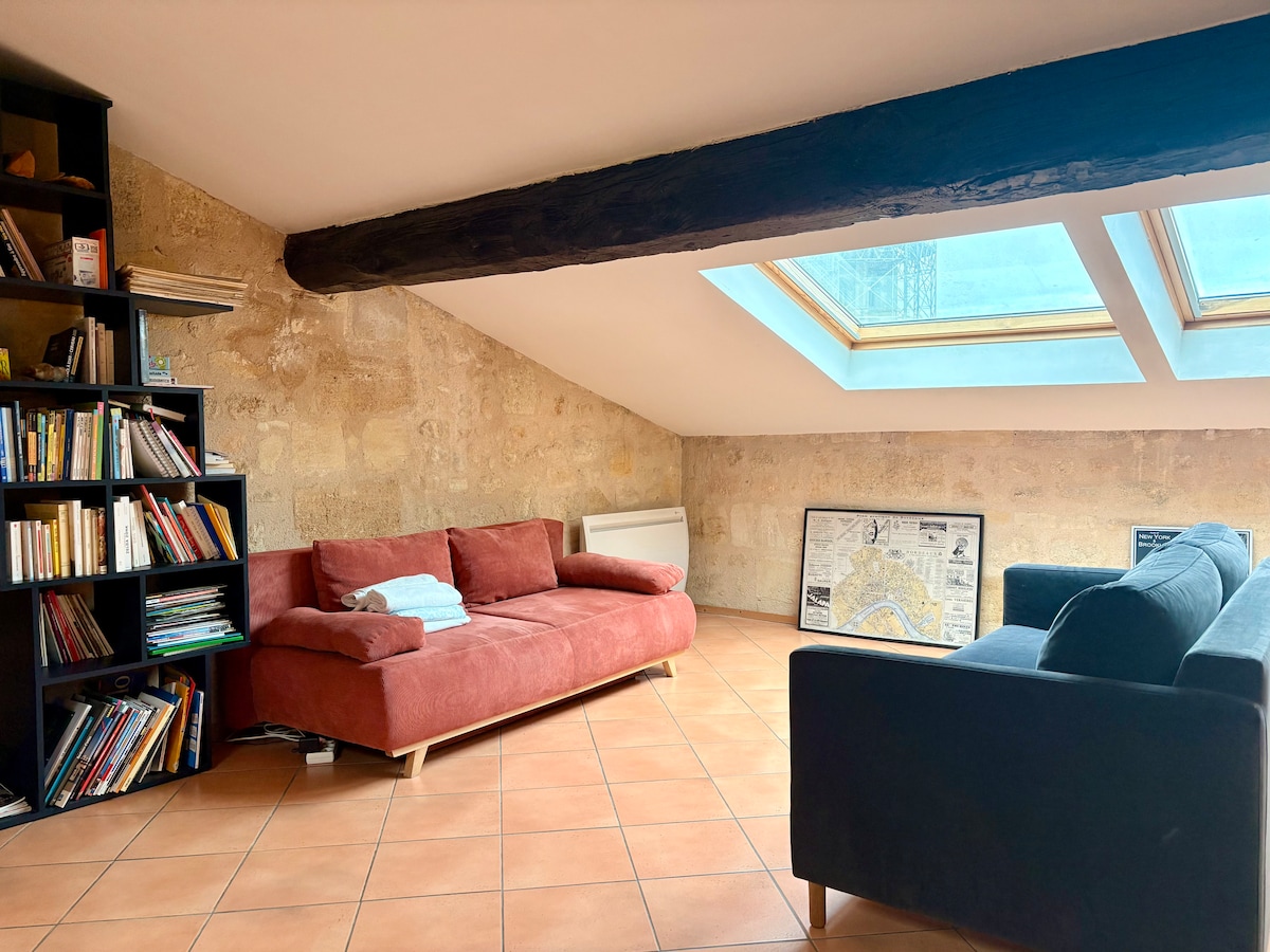 You are welcome in my beautiful 1 bedroom flat typically "Bordeaux style" with its limestone wall and its extravagant marble fireplace. Full of character, very clean, comfortable and light, it has the best location in the most charming part of the old city-center. Easy access by foot to all places in the city center. The apartment is on the 1st floor (without lift) of a 19th century building. There is a PUBLIC CAR PARK (NOT FREE) called "Camille Julian" at 20 m away from the building.