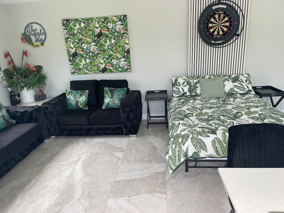 Studio/Cabin with en-suite shower and toilet, kitchen with microwave, fridge, small oven, toaster, kettle, cups and plates provided. Freeview TV, bed linen and towels heating and hot water included. Off road parking with own access to studio, a two minute walk to beach, local shops and Hayling Island beach. Would suit walkers and cyclists to explore the area. Dog allowed. No smoking. A new 5 foot pullout sofa bed has now replaced the old 4 foot bed for a more comfortable, sleeping experience.