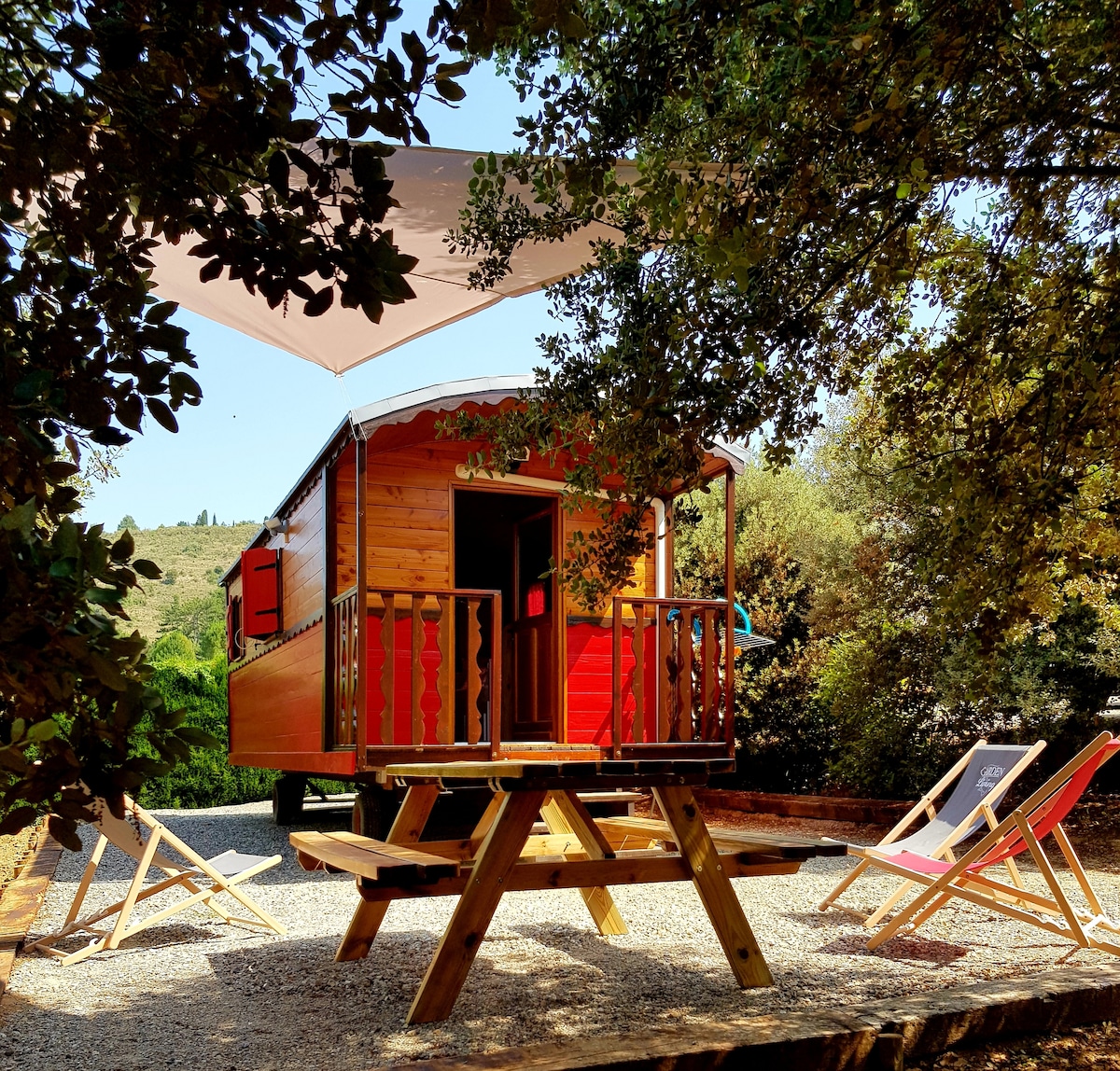 - gîte : roulotte unique en pleine nature pas de voisin 4 km du village nettoyé et désinfecté entre chaque client . vous profiterez d'un exterieur pour vous détendre sur des chaises longues , prendre un apéro ou mangé dehors aux chants des cigales ou des petits oiseaux . - 40 km de st guilhem le désert classé parmis les plus beaux village de france - 15 KM de la mer - 15 KM de la ville de montpellier - 20KM du port de sète - petit déjeuné en supplément 10 euros /personne
