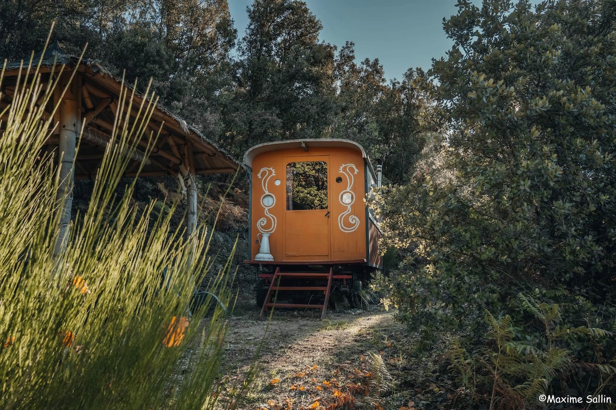 Unwind in a comfortable and sturdy atypic caravan nestled in the woods, high above the village, at the gateway to the Sidobre region. La Verdine, opens directly onto a peaceful nature walk, is equipped with a bed in a lovely alcove, a new mattress, woody aromas, a small clawfoot bathtub, a kitchenette (with quality utensils and pdcts), and a convenient dry toilet (just steps outside). Explore the village, iconic castle, bars/cafés, restaurants, grocery stores, beautiful hikes, lakes, and rivers.