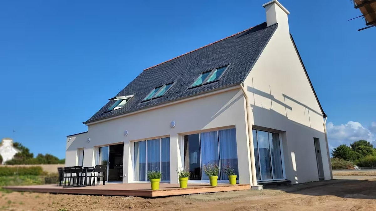 Maison contemporaine, vue exceptionnelle et unique sur la mer, les îles de Port Blanc, la baie de Pellinec, les 7 îles au large de Perros Guirec. Située près du petit port de Buguéles, à quelques minutes à pied des premières plages et à 2,5km du bourg de Penvenan, avec tous ses commerces, son marché et son supermarché. La maison est composée d'une grande pièce de vie de 50m2, 3 chambres, 3 salles de bains, 2 toilettes, 3 terrasses, un jaccuzzi. Nos amis les animaux ne sont pas admis.