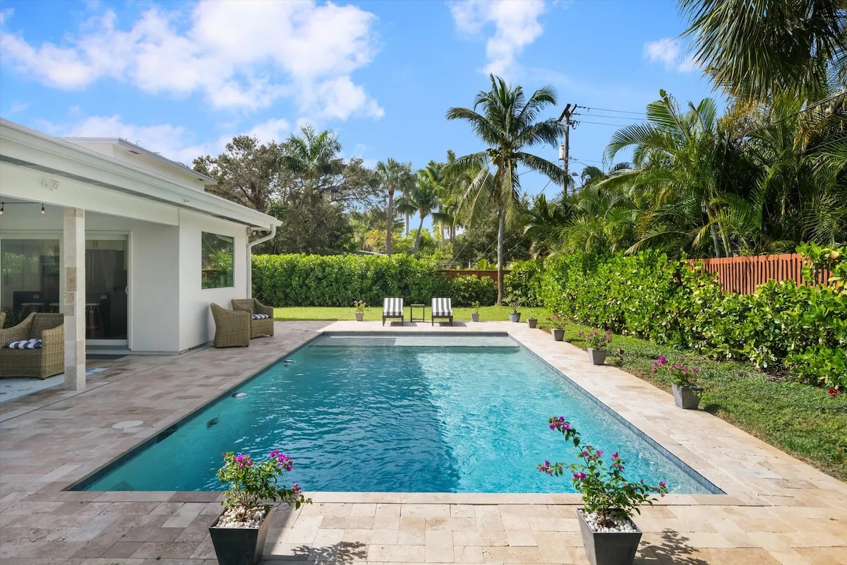 Welcome to Hideaway cottage, a brand new completely remodeled 3 huge bedroom 3 bathroom home just 2 blocks from the Intracoastal and 4 blocks from the beach, nestled on almost half a acre of lush tropical gardens in Lantana FL. Situated on a quiet street enjoy all the comforts of a modern home inside, with beautifully decorated rooms, fully stocked kitchen, dining room, living room, game room with slots, arcades, Atari and office. Massive screened in lanai and gigantic secluded back garden.