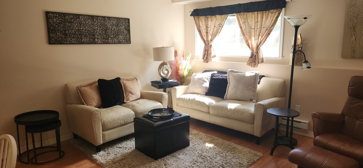 Clean, comfortable, private one bedroom with private bathroom and private entrance with patio in a quiet, scenic neighborhood. Laundry facilities, new queen size bed, queen size pull out sofa, television with cable(HBO, Crave, and movie channels),Netflix, and Prime. Fast,reliable wifi. Coffee, tea and some basic breakfast foods provided. Ten minute walk to beautiful beach. Close to shopping, restaurants and hiking trails. Pets welcome. Fully fenced yard.