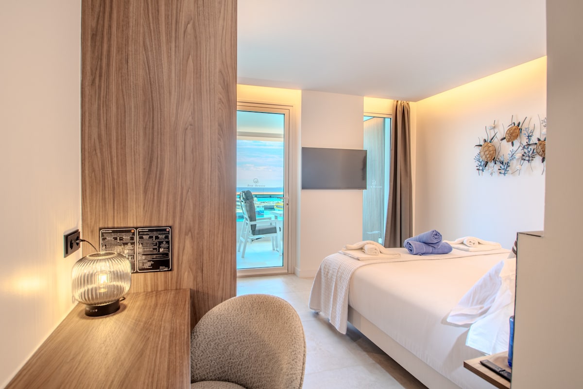 Luminosa Suite con dos terrazas con vista 360 grados de la isla. Equipado con Smart TV y conexión Wi-Fi gratuita, consta de un amplio dormitorio con una cama king size (200 x 200 cm), un salón con sofá cama doble, un amplio baño con ducha. Con nevera, cafetera Nespresso y hervidor. Perfecto para vacaciones de relax, tranquilidad y contacto con la naturaleza. El precio incluye el desayuno continental tipo buffet para dos personas