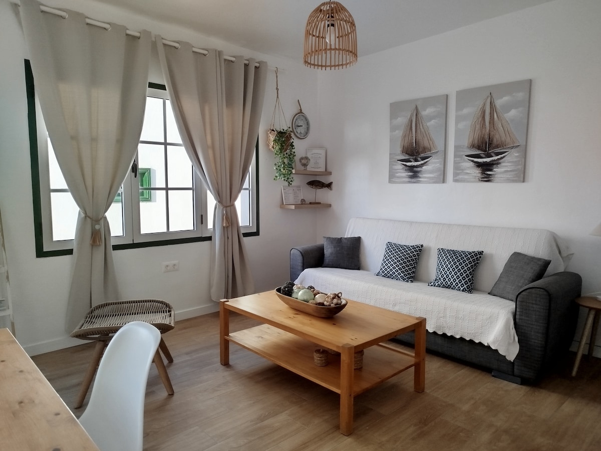 **Apartment with Spectacular Views of Neighboring Islands** Located on the upper floor (stairs required). Air conditioning in the bedroom and living room. 1 double bedroom (180 cm bed). Private bathroom with shower and hairdryer. Living-dining room, kitchen equipped with a dishwasher, Nespresso coffee machine, etc. Terrace with a private solarium, sun loungers, and outdoor dining area. Free Wi-Fi, Smart TV, and beach towels. Cleaning included.