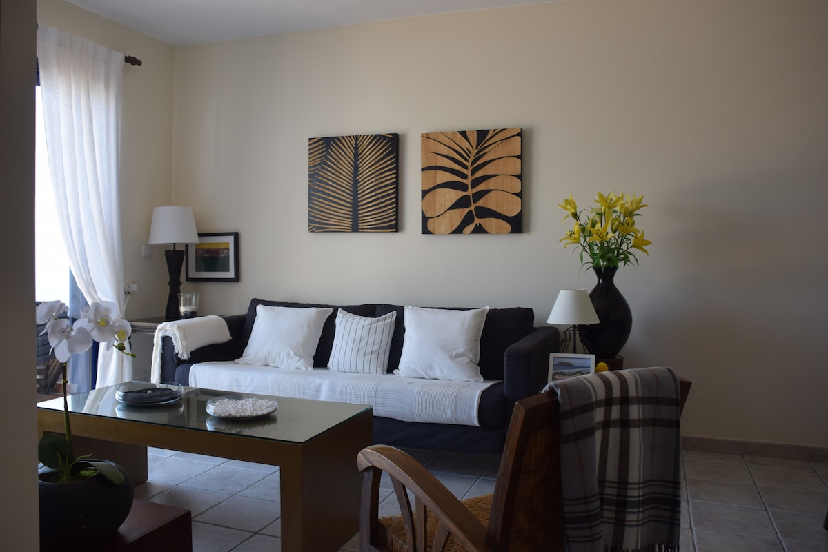 One-bedroom apartment with air conditioning and spectacular sea views. Private bathroom with shower, towels, and hairdryer. Living room - kitchen and terrace with outdoor furniture and solarium with loungers. Just a 2-minute walk to the beach. The apartment includes a safe, washing machine, fully equipped kitchen, microwave, bed linen, iron, Nespresso, and free high-speed Wi-Fi. Crib and high chair available upon request at no extra cost. *Includes cleaning and beach towels.
