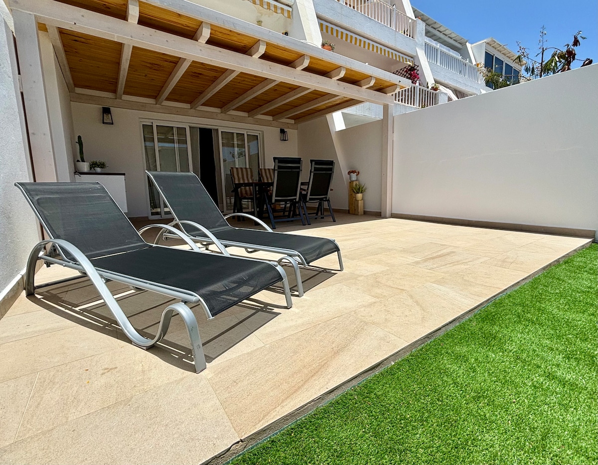 Modern ground-floor 1-bedroom apartment, with spacious and bright living room, fully equipped kitchen, and large terrace with outdoor dining area and panoramic pool views. The apartment is equipped with air conditioning for your comfort. The residence offers two swimming pools, both with free sun loungers and umbrellas, as well as a children’s playground and complimentary parking. Ideally located just a 5-minute walk from “Los Charcos” beach and 10 minutes from the centre of Costa Teguise.