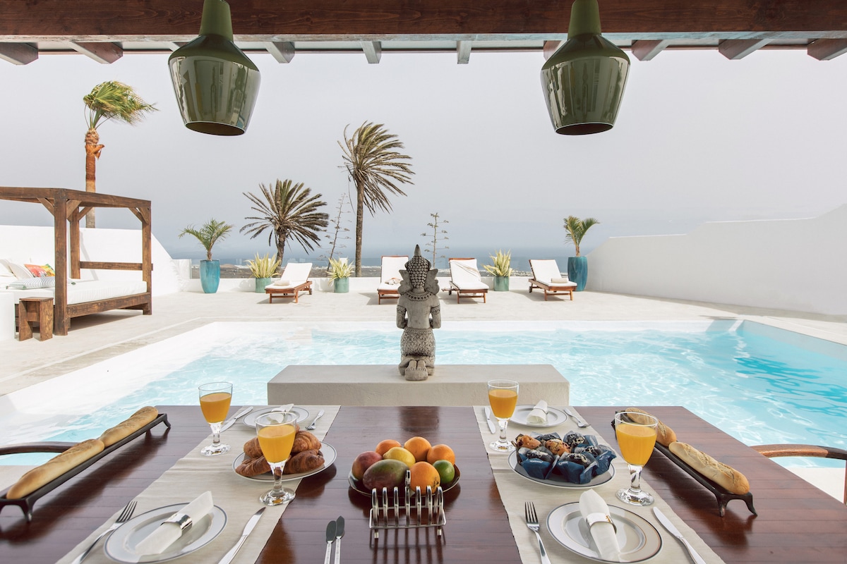 Las villas Deluxe destacan por su estilo decorativo árabe moderno fusionado con la arquitectura lanzaroteña. En una misma planta conviven 2 dormitorios lujosos con 2 modernos baños, un amplio salón con cocina americana y un enorme ventanal con vistas al jardín privado. En este último se puede disfrutar de una gran piscina con solárium y zona para disfrutar de un rico desayuno al sol o ver las maravillosas puestas de sol de la isla.