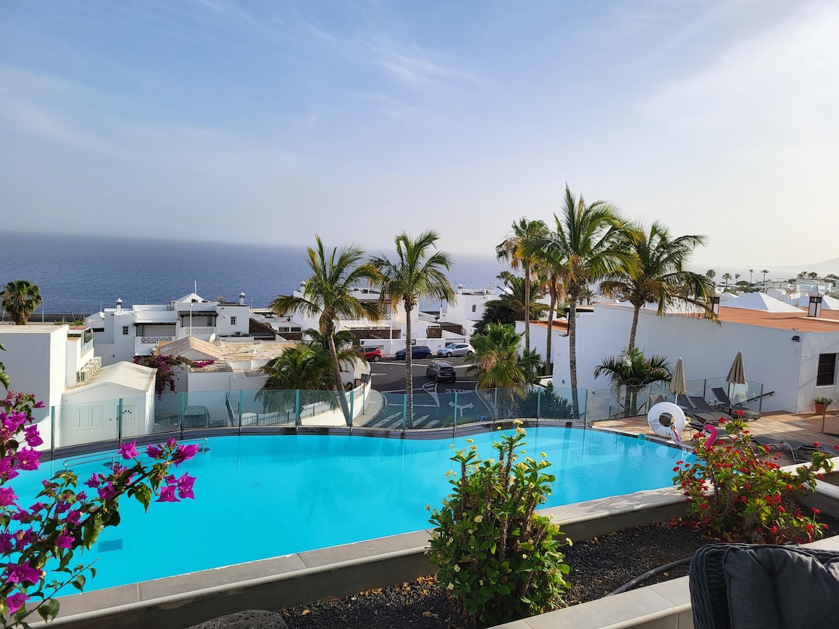 Apartamento ideal para 4-6 personas con increíbles vistas al mar y acceso directo a la playa grande de Puerto del Carmen. 2 habitaciones, 1 baños vegetal , zona común del salón-comedor y cocina totalmente equipada Disfrutarás de una acogedora estancia en un apartamento reformado por arquitecto con elegancia, con toda clase de comodidades a tu alcance. La zona de la piscina Manrique y su terraza ofrecen la posibilidad de disfrutar al máximo de los exteriores de la casa.