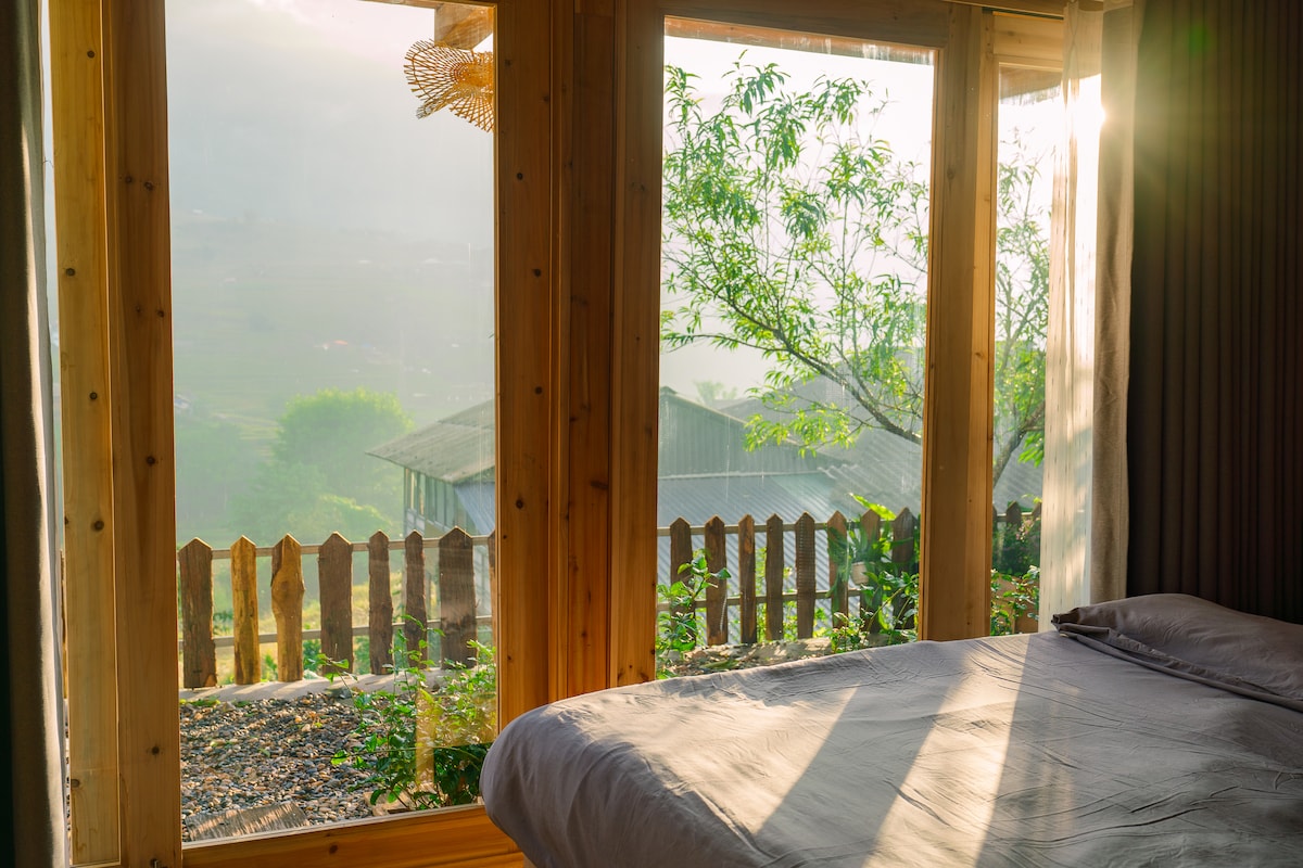 🏡 Private room in a Black Hmong family's home, nestled in a quiet mountain village. 🛁 Cozy and simple, with a bathtub and large windows overlooking rice terraces and forested peaks. 🌿 A perfect place to relax, enjoy nature, and experience slow village life.