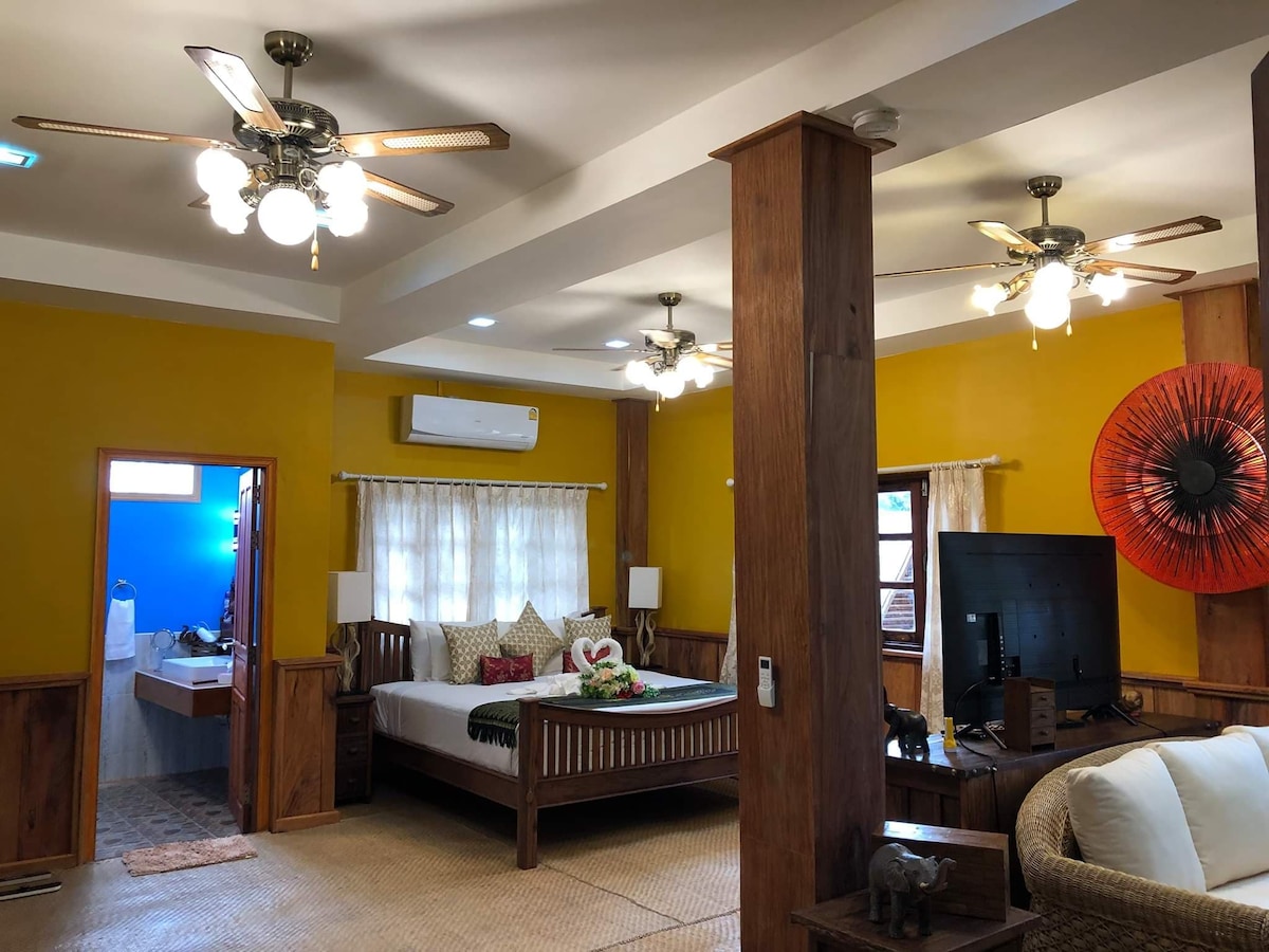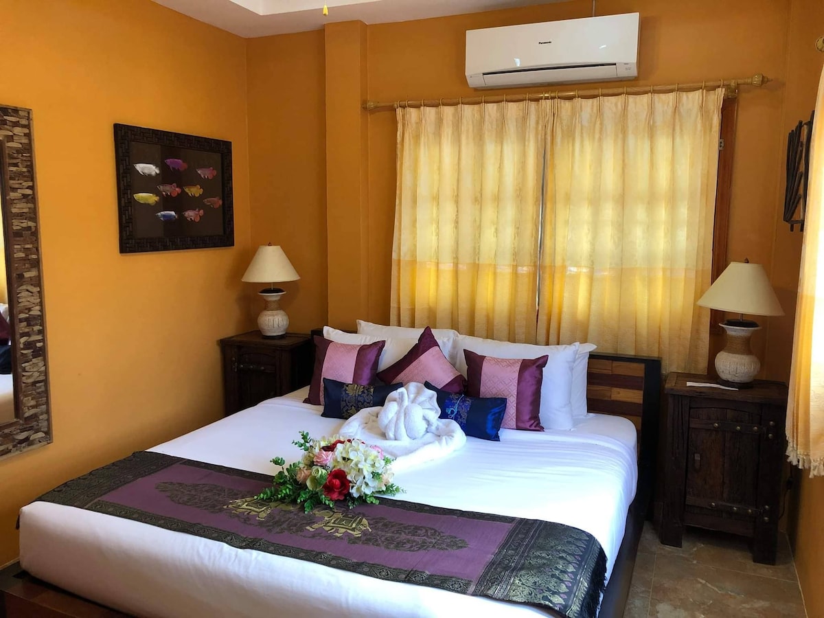 Our Deluxe double bedroom with 1 king size bed for 2 people. This deluxe room has ensuite with air-con, ceiling fan, Fridge, cable LED TV, unlimited wifi, table & private PORCH. Fre room service every day. We also have a lovely shared balcony, coffee& coffee hot and cold water available 24/7.