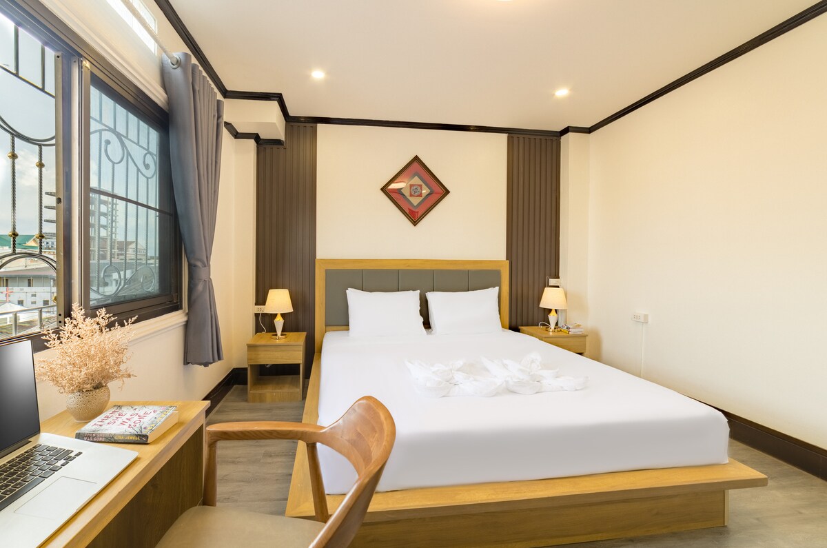 Enjoy a spacious 15m² room with window panoramic city views of Vientiane. The room is fully equipped with air conditioning, hot shower, TV, fridge, and wardrobe—everything you need for a comfortable stay. Bright, clean, and quiet, it’s perfect for relaxing after a day in the city. Free parking is also available on-site.
