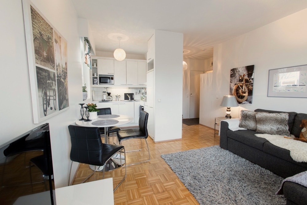 City apartment in great location. There’s one bed and sofa bed and if needed more sleeping spaces there is possibility for airbeds,please notice this before you book. Ask, if you like to check in outside check in and out times, It’s possible, I am flexible if I can. Area is quiet and you can go everywhere there. Centre only couple 100 meters away and buss stops just around the corner. Apartment is well recovered. There is parking space and pets are allowed.